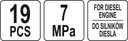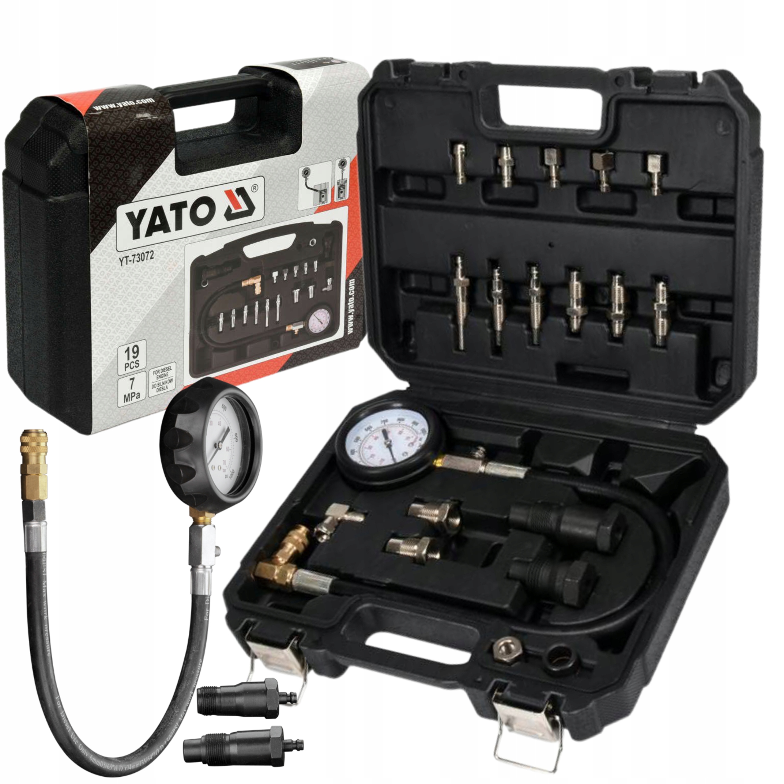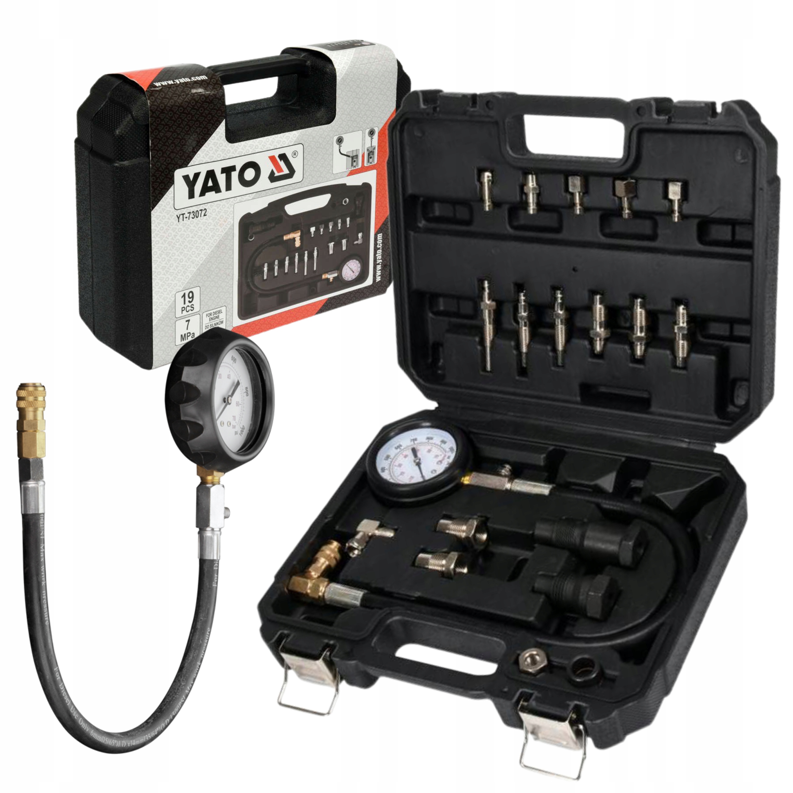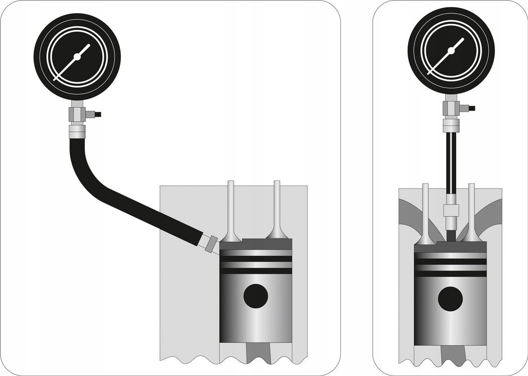 Profesjonalny zestaw do pomiaru ciśnienia kompresji w cylindrach silników wysokoprężnych (diesel). Pomiaru można dokonać przez świece żarowe lub przez wtryskiwacz. Przeznaczony do samochodów osobowych, dostawczych i ciężarowych, w tym do aut z silnikami TDI, HDI, SDI, DTI, JTD, DID z wtryskiem bezpośrednim i pośrednim.