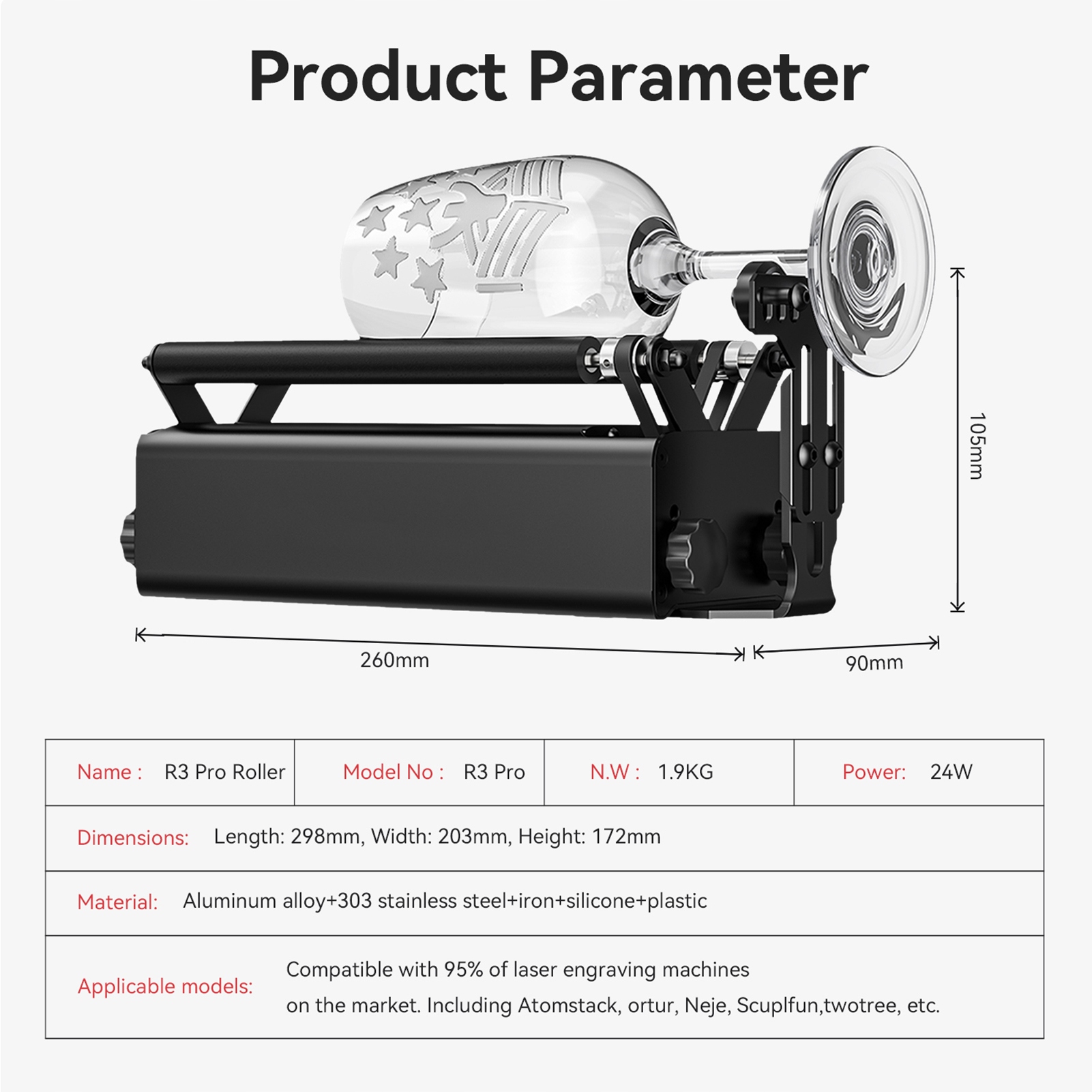 11. R3 PRO dodaje kolumny wspierające, które mogą grawerować nieregularne okrągłe kubki, takie jak kielichy.