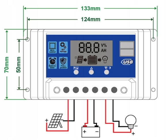 ⭐ Zabezpiecza przed przeładowaniem akumulatorów oraz nadmiernym rozładowaniem przez odbiorniki podłączone do regulatora.