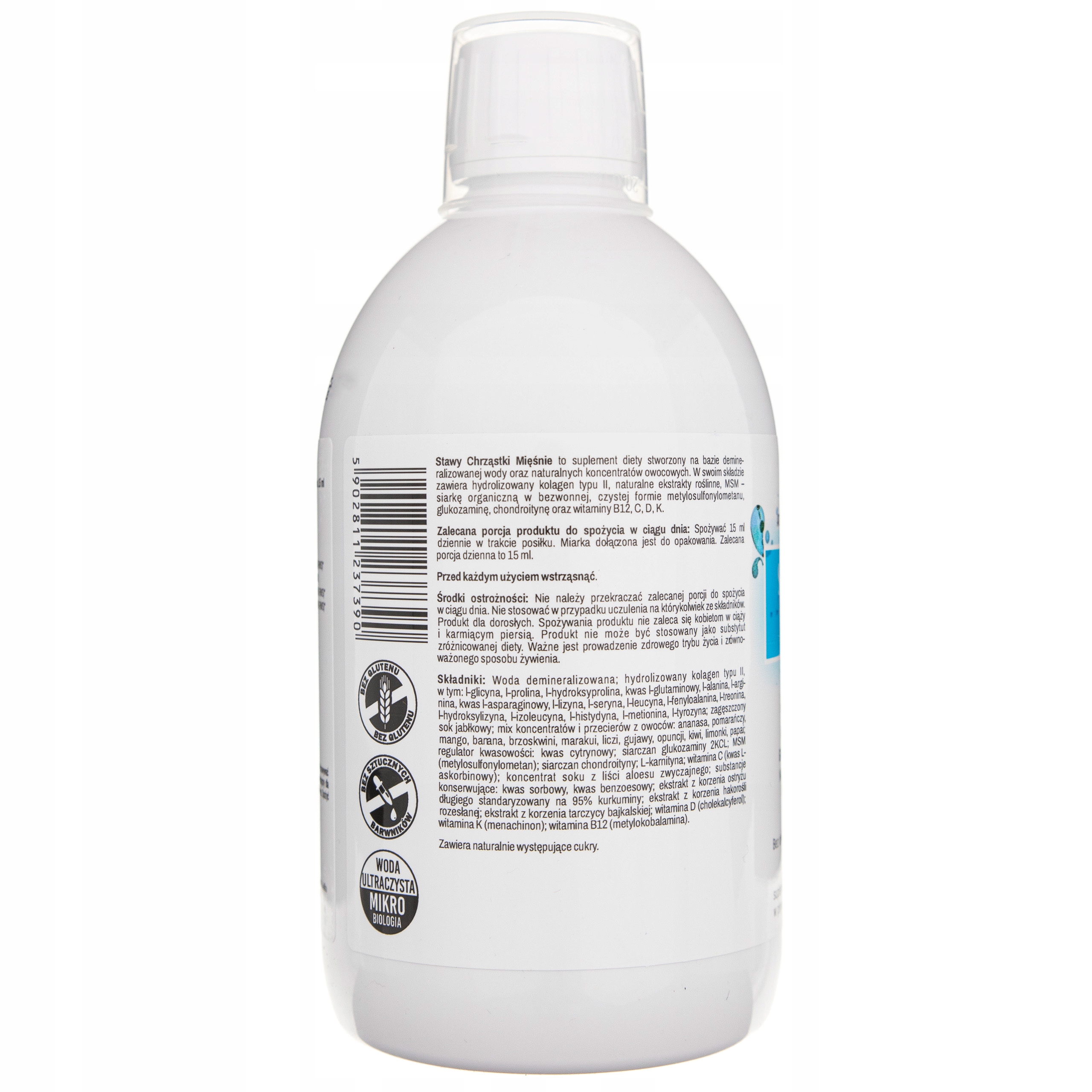 Składniki Woda demineralizowana, ultraczysta; hydrolizowany kolagen typu I i III, w tym: l-glicyna, l-prolina, l-hydroksyprolina, kwas l-glutaminowy, l-alanina, l-arginina, kwas l-asparaginowy, l-lizyna, l-seryna, l-leucyna, l-fenyloalanina, l-treonina, l-hydroksylizyna, l-izoleucyna, l-histydyna, l-metionina, l-tyrozyna; zagęszczony sok jabłkowy; mix koncentratów i przecierów z owoców: ananasa, pomarańczy, mango, banana, brzoskwini, marakui, liczi, gujawy, opuncji, kiwi, limonki,papai; siarczan glukozaminy 2KCL; MSM (metylosulfonylometan); siarczan chondroityny; l-karnityna (L-carnitine); witamina C (kwas L-askorbinowy); koncentrat soku z liści aloesu zwyczajnego; substancje konserwujące: sorbinian potasu, benzoesan sodu; ekstrakt z korzenia ostryżu długiego standaryzowany na 95% kurkuminy; ekstrakt z korzenia hakorośli rozesłanej (Harpagophytum procumbens); ekstrakt z korzenia tarczycy bajkalskiej (Scutellaria baicalensis); witamina D (cholekalcyferol); witamina K (menachinon); witamina b12 (metylokobalamina)