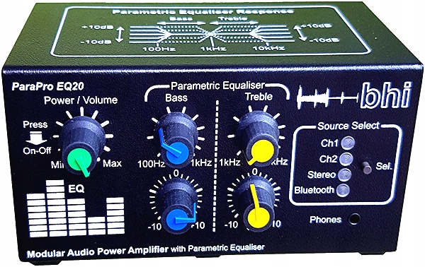 BHI ParaPro EQ20-DSP oferuje dwa kanały parametryczne Bass i Treble. Regulowana częstotliwość basowa od 100Hz do 1kHz, częstotliwość sopranowa w zakresie od 1kHz do 10kHz.