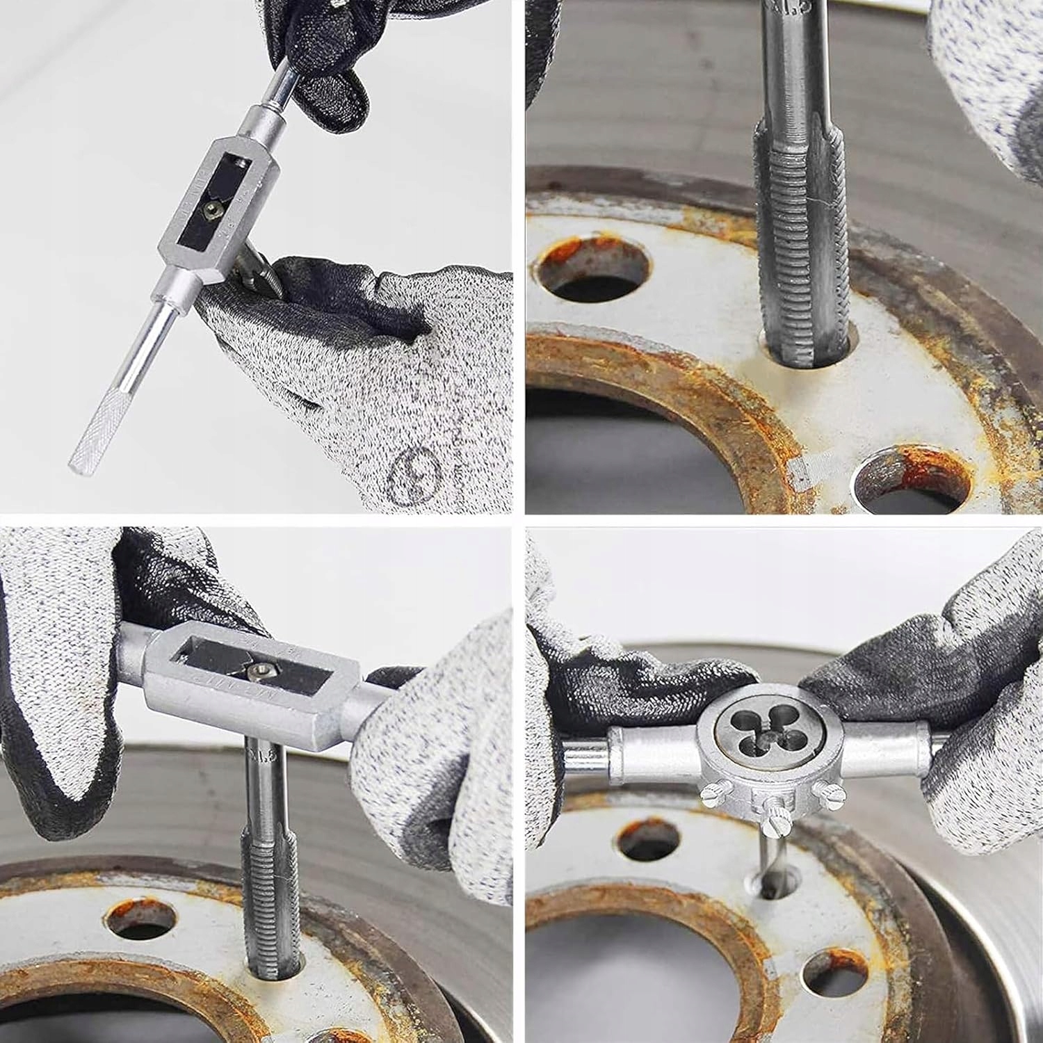 Zestaw zawiera gwintowniki, narzynki i pokrętła przeznaczone do gwintowania ręcznego.