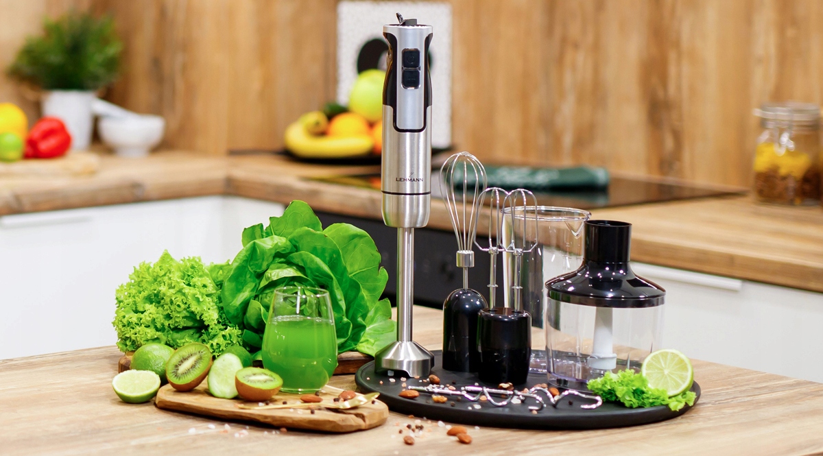 Blender Lehmann он отличается универсальностью благодаря богатому набору аксессуаров и прилагаемой градуированной рулетке он обеспечивает точность при измерении ингредиентов, что является ключевым во многих рецептах. в комплект входит ручной блендер с металлической насадкой для смешивания, идеально подходит для супов и коктейлей, венчики для смешивайте легкие пирожные и кремы и взбивайте сливки и яичные белки венчиком. Крючки для разминание облегчает приготовление дрожжевого теста, а мини-мясорубка с режущим ножом отлично хорошо подойдет для измельчения трав и орехов.