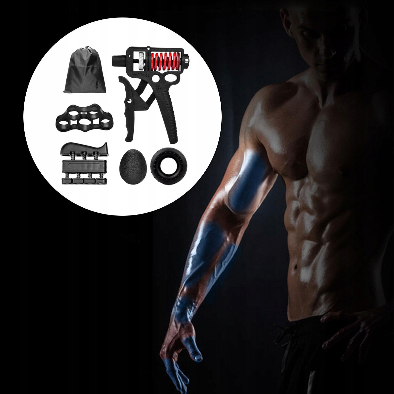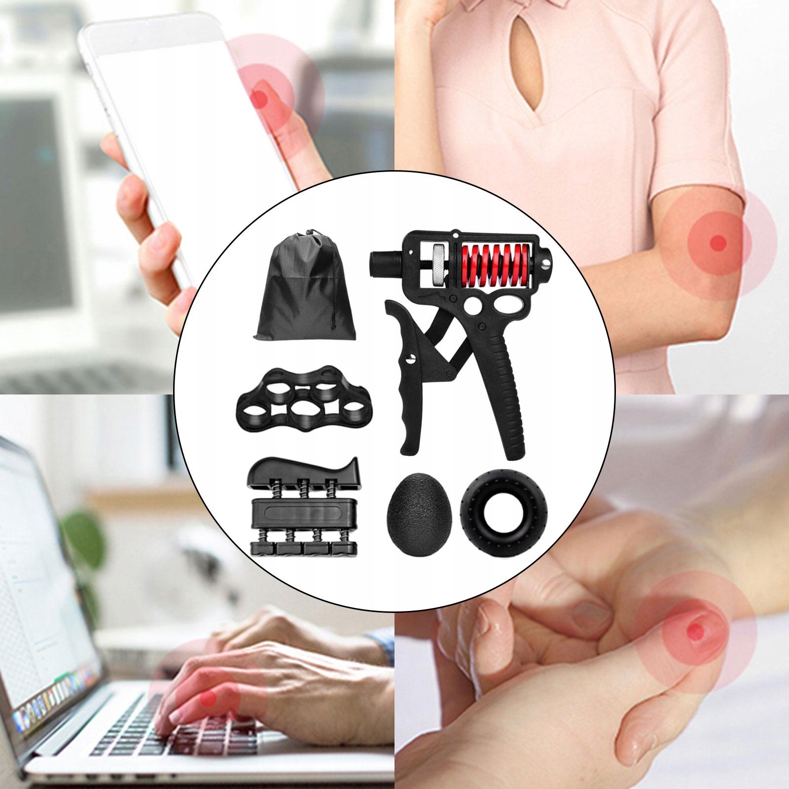 5 SZTUK ZESTAW WZMACNIACZY UCHWYTU DŁONI: Zawiera regulowany wzmacniacz chwytu dłoni, trener palców, taśmę oporową do noszy palców, siłę dłoni , piłkę chwytną. Pomaga wzmocnić i uelastycznić dłonie, palce, nadgarstki, przedramiona, mięśnie brachialis.