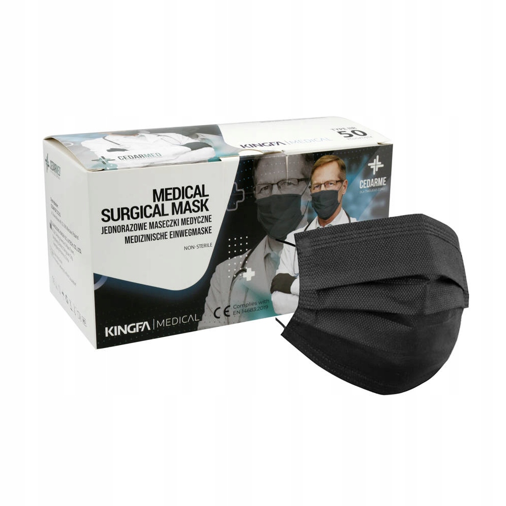 Jednorazowe maski medyczne w kolorze czarnym, 50 sztuk w bezpiecznym, ochronnym kartoniku ułatwiającym dozowanie.