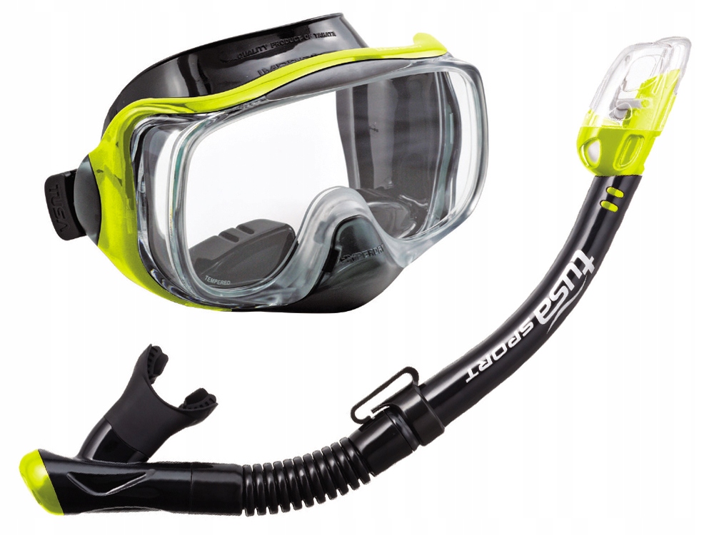 Комплект погружение в коллекции Tusy. Маска с одним большим стеклом дает огромное поле зрения a использование одностороннего клапана в носовой камере повышает комфорт и безопасность.