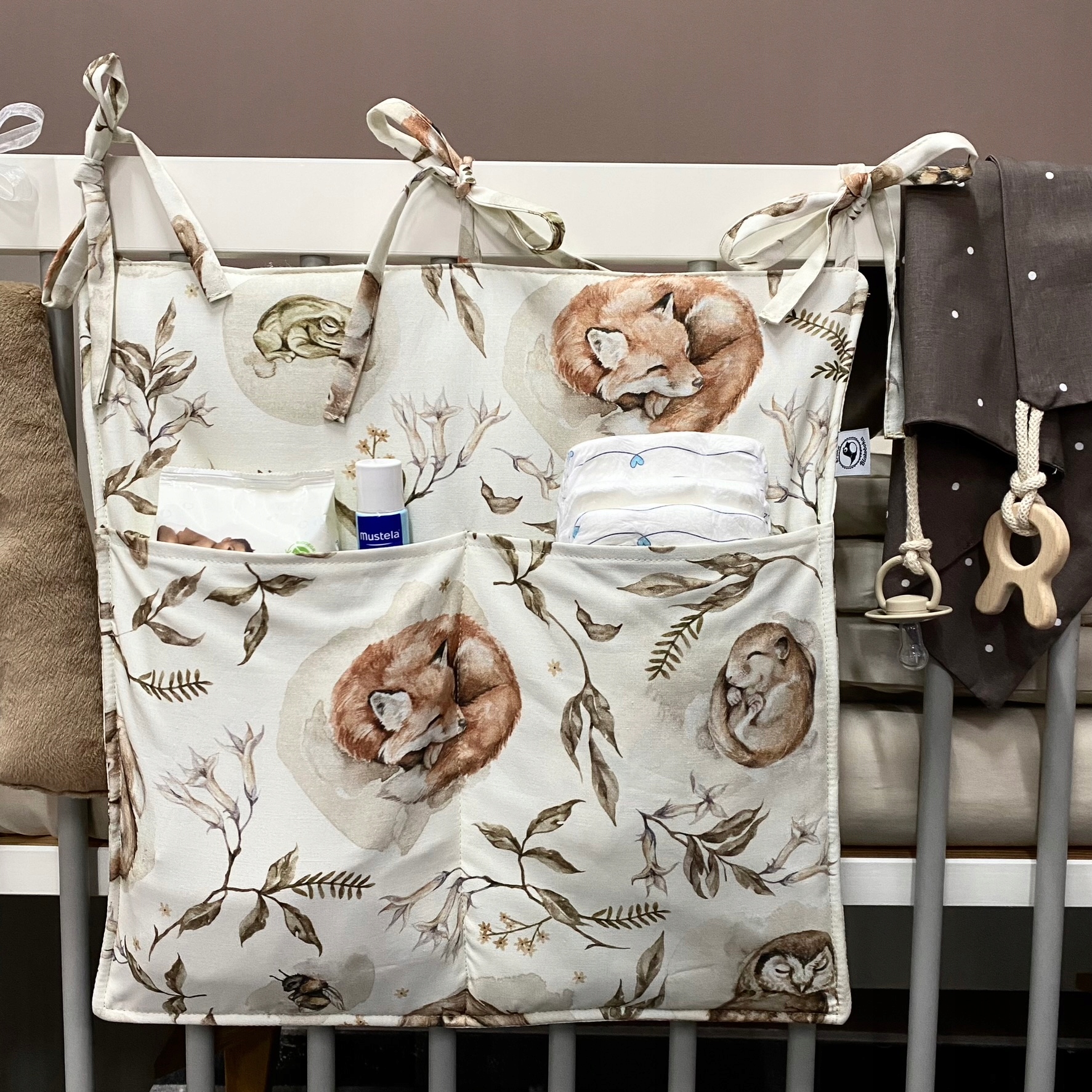 Bawełniany organizer na łóżeczko, łóżka lub przewijak. Ułatwia codzienną opiekę nad maluszkiem podczas przewijania czy kąpieli. Posiada dwie duże kieszonki, w które można włożyć najbardziej potrzebne akcesoria higieniczne tj pieluszki, mokre chusteczki czy też kosmetyki do pielęgnacji. Uszyty z bawełny, w środku miękka antyalergiczna ocieplina, praktyczne wiązanie na trzy troczki sprawia, że organizer nie opada, nie zsuwa się. Możliwość doboru całego kompletu do łóżeczka w tym wzorze.