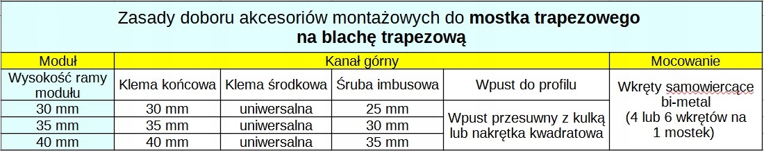 Kanał górny umożliwia zamocowanie panelu fotowoltaicznego za pomocą klem końcowych i środkowych do mostka z zastosowaniem śrub imbusowych M8 (5mm krótszych niż wysokość klemy końcowej i ramy panela) i wpustów przesuwnych M8 z kulką lub nakrętek kwadratowych. Przykręcany bo blachy trapezowej za pomocą blachowkrętów M6 (patrz tabela poniżej).
