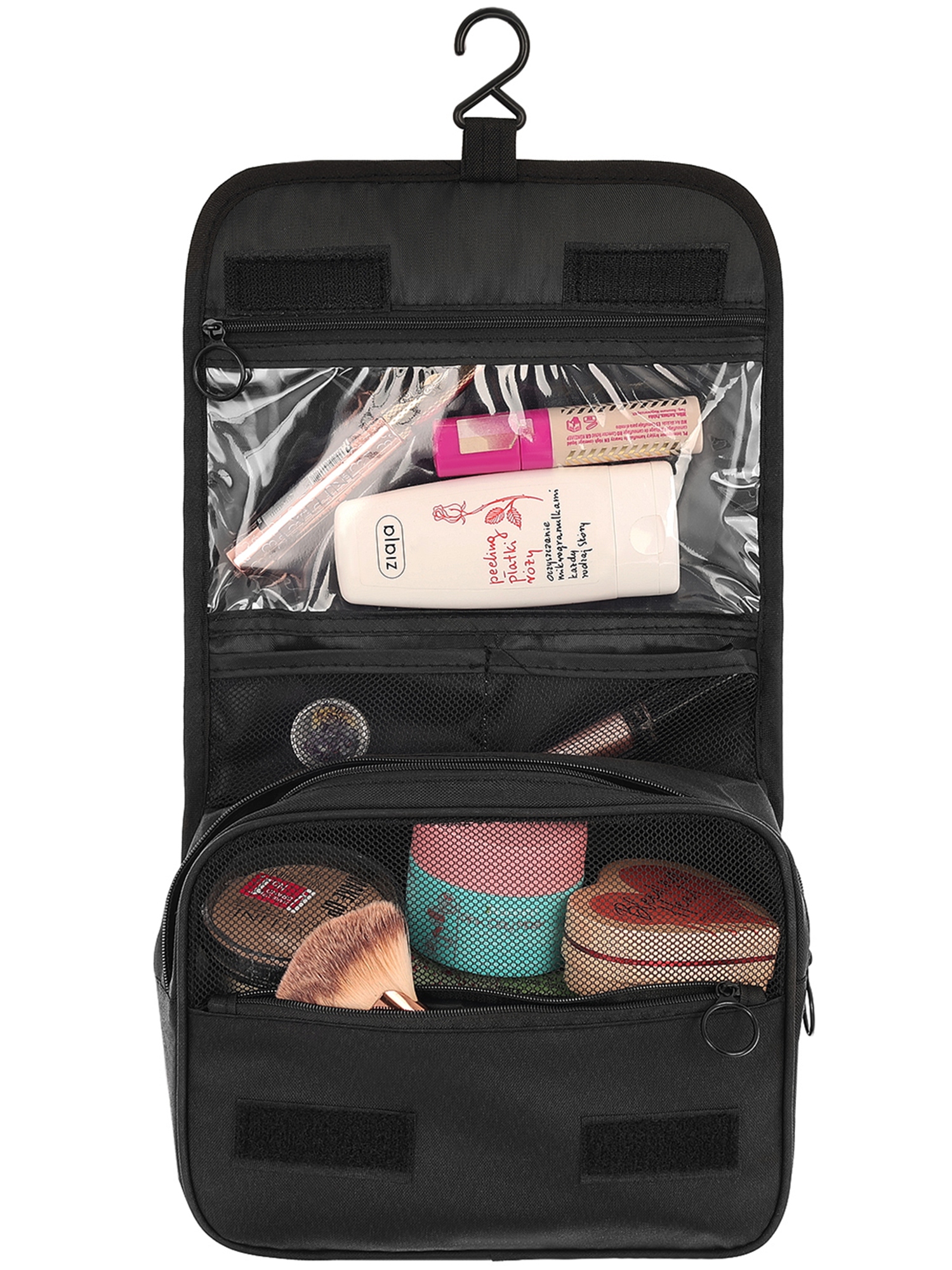 Специальный крючок позволяет подвеске косметички, что очень практично в отелях, кемпингах или в домашних ванных комнатах, где часто не хватает места для размещения всей косметики.