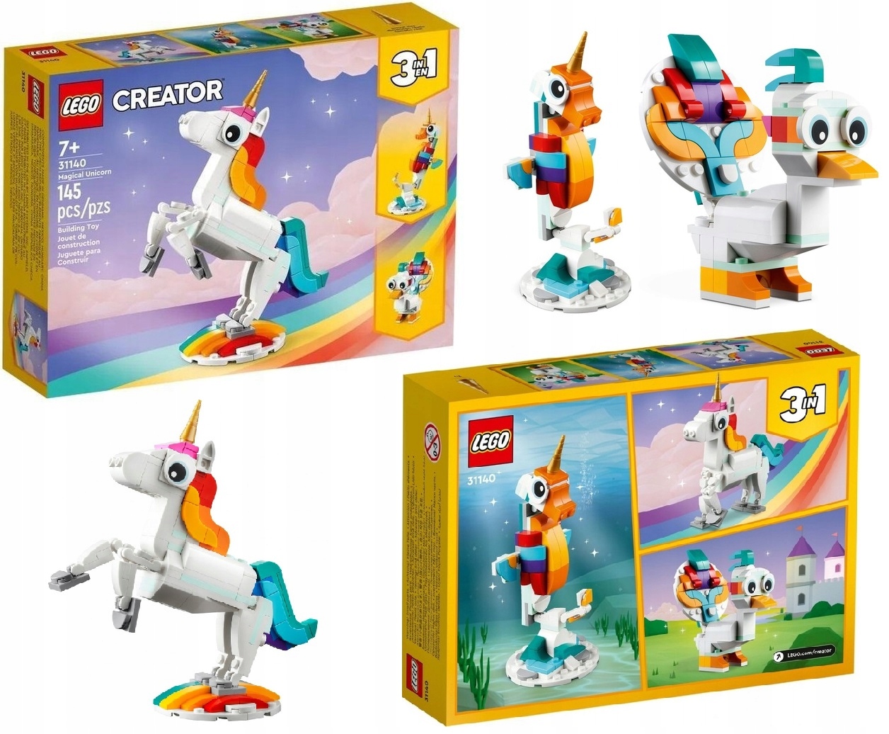 С этим 3 в 1 волшебный строительный набор единорог (31140) земли, где будут разыгрываться захватывающие истории. В комплект входит единорог с золотым рогом, цветным хвостом и подвижными ногами и копытами.
