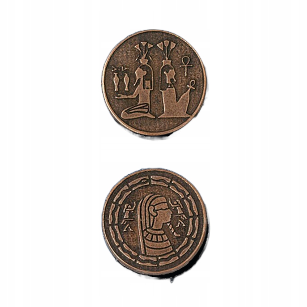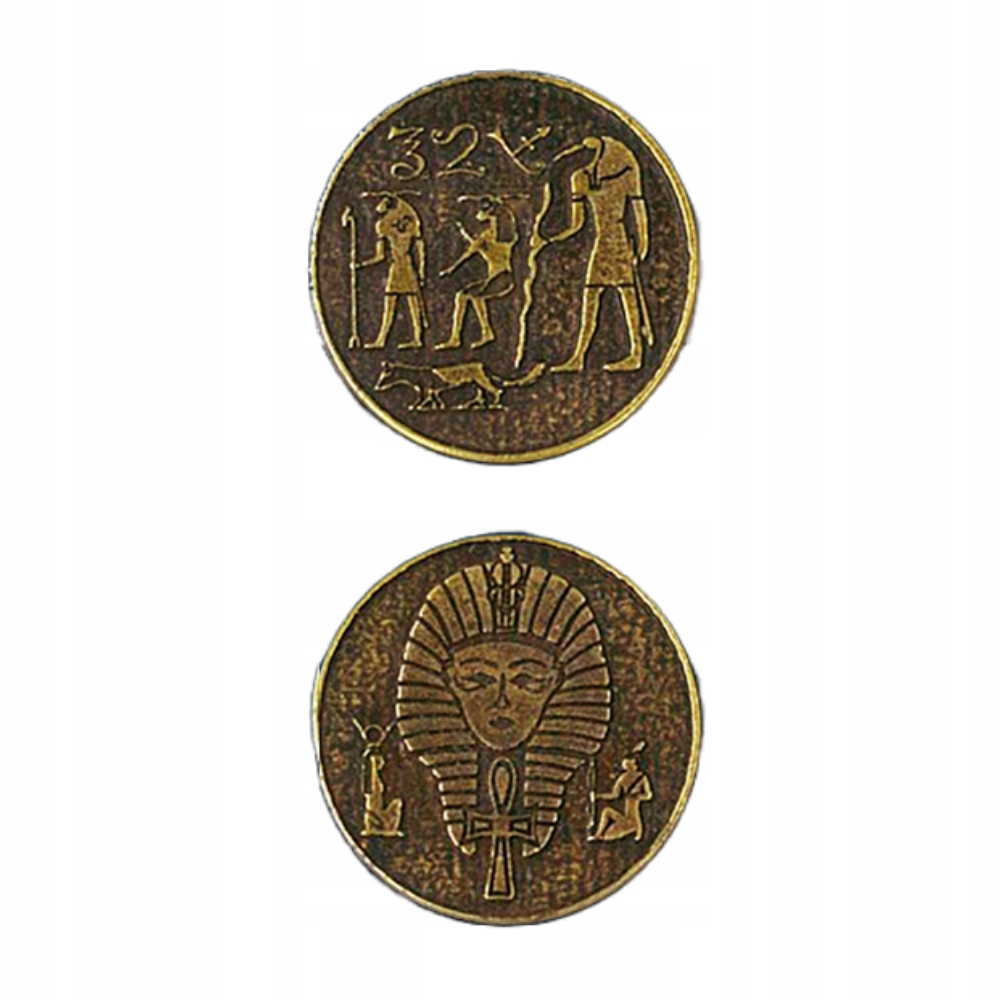Wykonany ze stopów cynku zestaw 3 cudownych, ciężkich monet które odkopaliśmy wraz ze skrzynią pełną skarabeuszy. Ktoś chce jednego? Amon Ra spojrzał na swój udręczony lud i zesłał im plagę urodzaju. Odtąd wody wylewały na wiosnę i rosiły pola, które latem dawały plon obfity. Set, widząc, co jego brat uczynił, przebrał się za śmiertelnika i wkradł na dwór faraona. Wtedy rzekł mu „Władco, proponuję szybszy sposób wymiany dóbr, niż gliniane tabliczki ryte przez twych skrybów. To nie ma tak, że jest to dobre czy niedobre, ale jeśli zapytasz mnie, co cenię w życiu najbardziej, odpowiem, że pieniążki. Twoi poddani będą czcić cię za to. Wybij monety ze swoimi podobiznami”. Faraon tak uczynił i przyozdobił pieniądz swym profilem, zawarł również na nich portrety bogów. Ra spojrzał po wielu dniach drzemki na swój lud i ze zgrozą odkrył przebiegły plan Seta. Odtąd Egipcjanie tworzyli chciwie majątek na fałszywych obietnicach narodowej waluty, uciskali chłopów i wprowadzili niewolnictwo, by gromadzić stosy monet w swoich skarbcach. Poważany nie był wytwórca, ale zdolny pośrednik, cwaniaczek bez skrupułów i moralności, pijawka społeczna na zdrowej tkance Egiptu. Amon Ra zezłościł się mocno na swój lud i zesłał im największą plagę znaną tamtemu światu – Izraelitów z magicznymi zdolnościami rozstąpienia Morza Czerwonego.