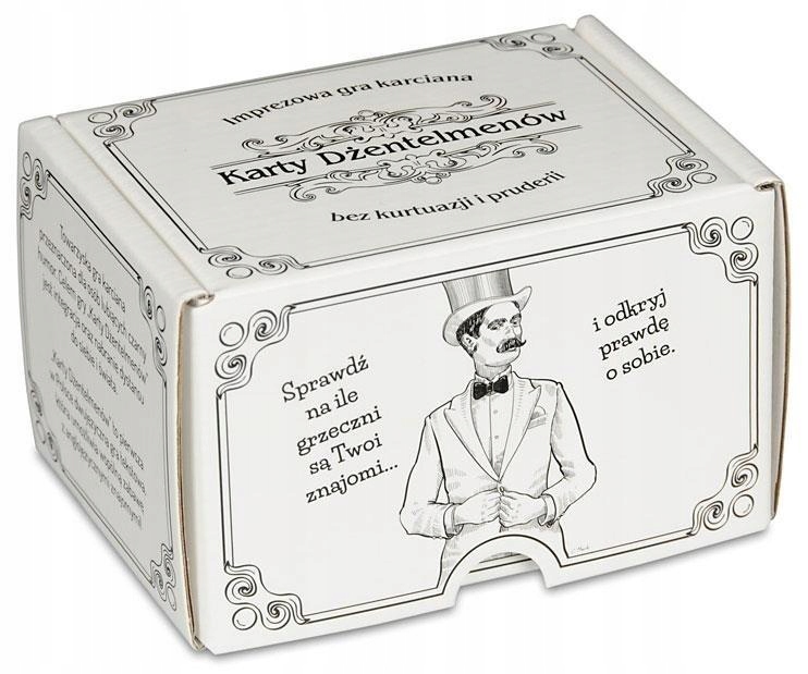 Karty Dżentelmenów to imprezowa gra towarzyska bez kurtuazji i pruderii, za to z ogromną dawką czarnego humoru. Dżentelmeńskie rozgrywki z pewnością urozmaicą każde spotkanie w gronie błyskotliwych i obdarzonych niebywałym poczuciem humoru osób. Nie powinno jej zabraknąć na Twojej imprezie! Produkt posiada przejrzyste zasady, co zachęci każdego do gry i pozwoli szybko wczuć się w atmosferę pełną czarnego humoru. Grą kieruje prosta mechanika: w każdej kolejce Dżentelmen zadaje pytanie z Czarnej Karty, a pozostali odpowiadają za pomocą swojej najzabawniejszej Białej Karty. Drugim sposobem wykorzystania gry Karty Dżentelmenów jest tworzenie z jej pomocą opowieści pełnych czarnego humoru bez cenzury. Podczas gry w Dżentelmeńskie Opowieści wszyscy gracze wspólnie tworzą absurdalne i wciągające historie w oparciu o frazy z Białych Kart. Pozwólcie się zaskoczyć efektami Waszej kreatywności! Gra Karty Dżentelmenów dzięki eleganckiej oprawie nadaje się na wyszukany i na pewno trafiony prezent. Jako jedyna na polskim rynku gra karciana zawiera anglojęzyczne odpowiedniki pytań i odpowiedzi, dzięki którym pokonuje bariery międzykulturowe i umożliwia zabawę na międzynarodowym poziomie.