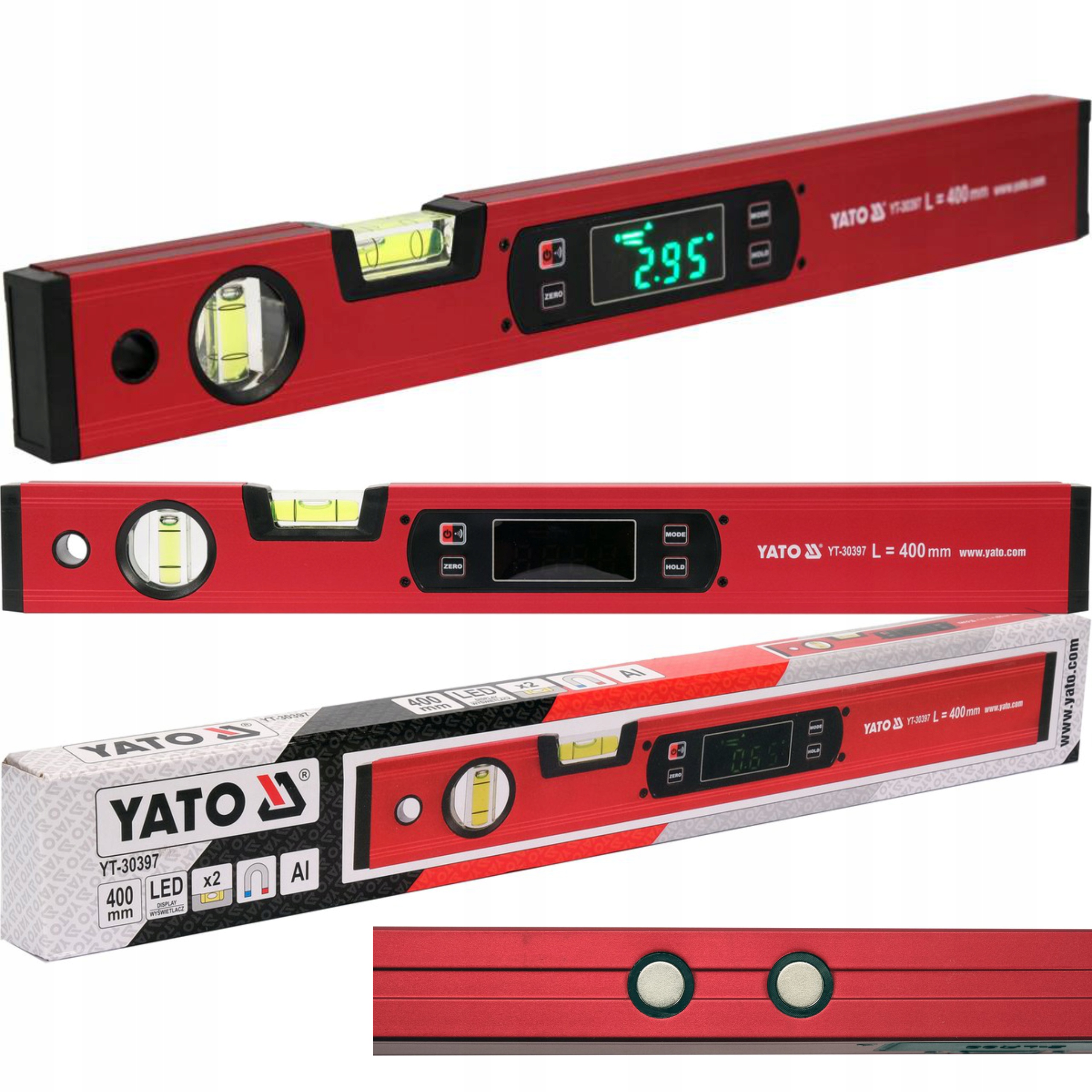 Электронный уровень 400 мм, алюминиевый корпус, анодированный. Он имеет две libelle и систему светодиодной подсветки. Измерительная плоскость точно фрезерованный с четырьмя сильными магнитами. Особенности-показания в градусах, процентах, миллиметрах или дюймах, блокировка результата измерения, звуковая сигнализация, автоматическое отключение. Питание от 2 батареек типа AAA 1,5 В.