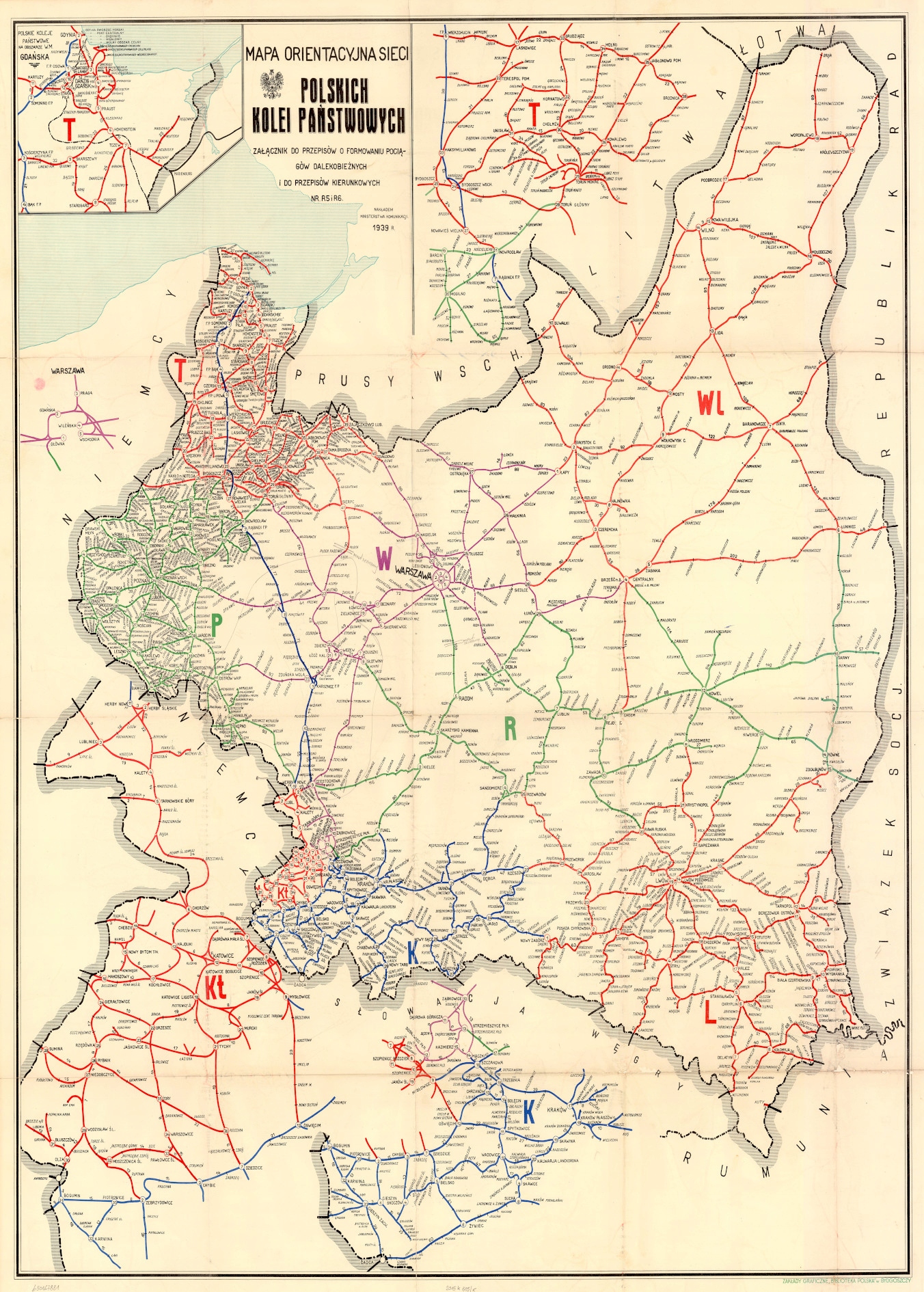 Старая карта Польские государственные железные дороги 1939г. 70x50cm