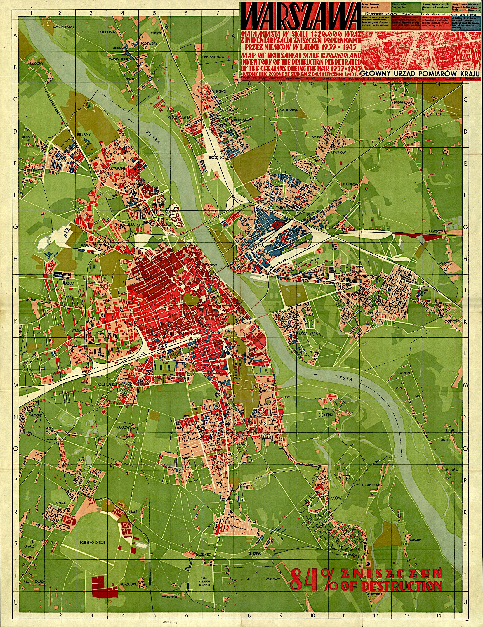 Stary plan zniszczen Warszawa 1949r. 50x40