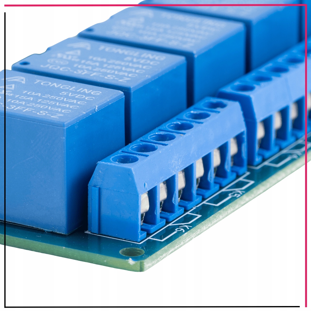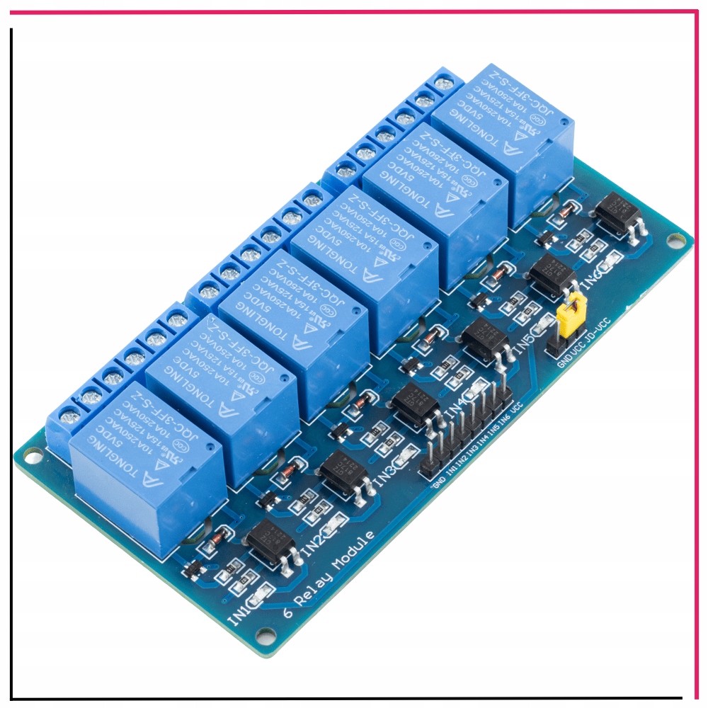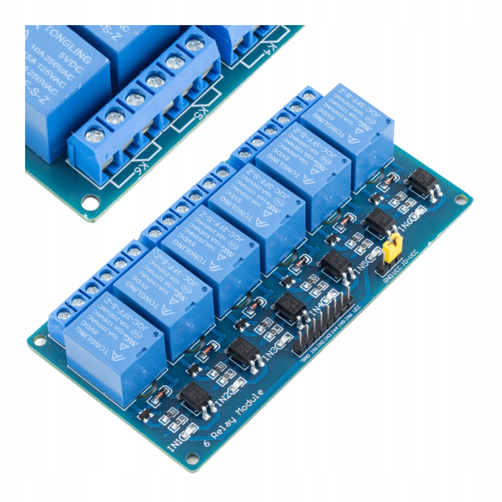 Moduł przekaźników 6-kanałowy 5V 10A to wysokiej jakości układ do sterowania urządzeniami zasilanych prądem przemiennym 230V. Oddziela galwanicznie sterowany układ od mikrokontrolera.