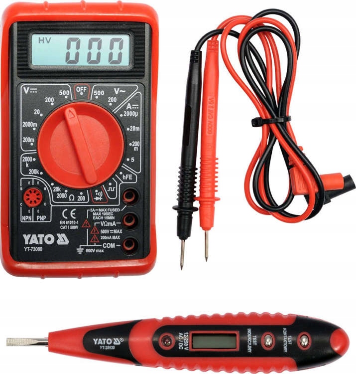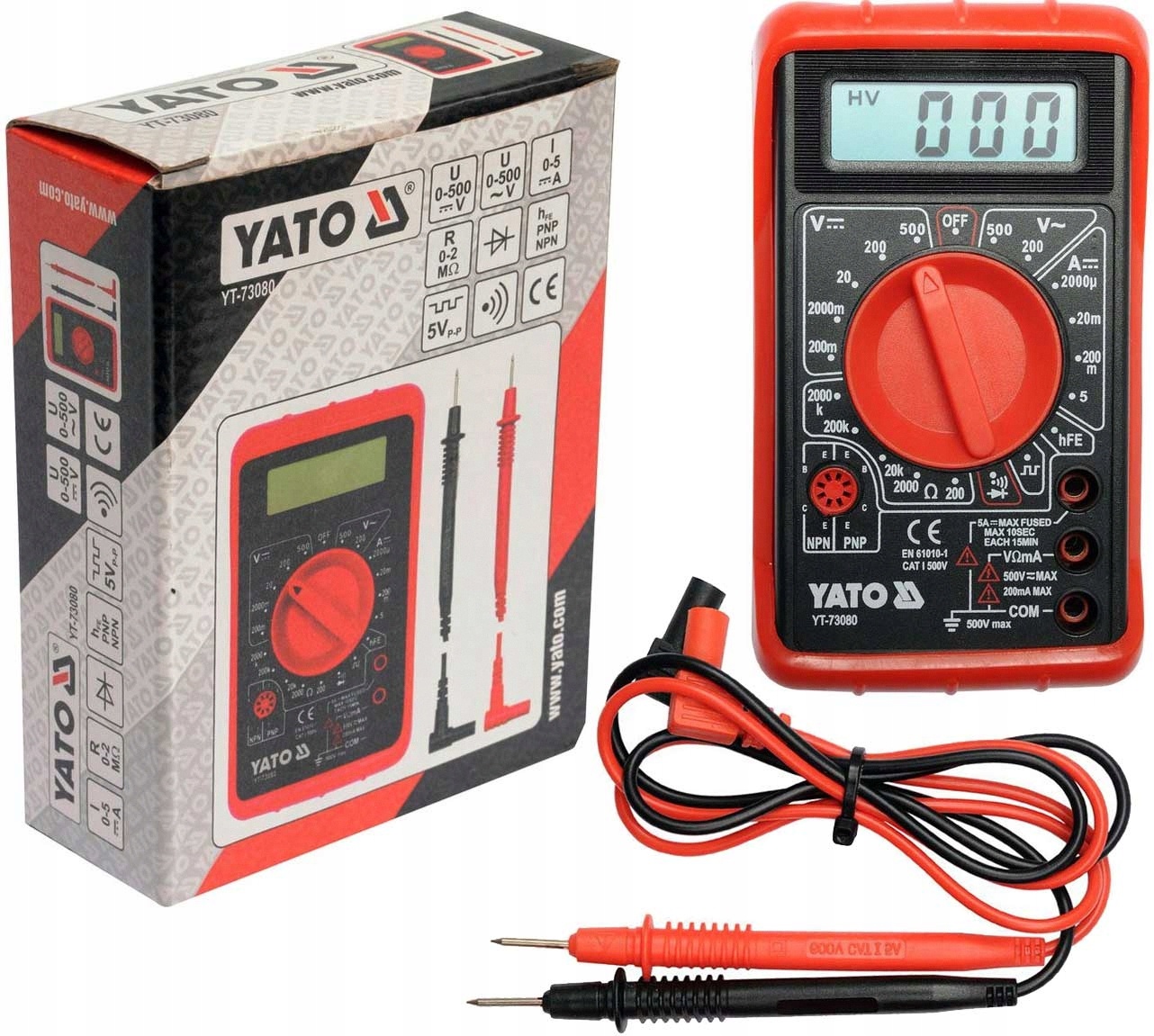 Multimetr marki YATO, pozwala na dokonanie pomiarów napięcia stałego lub przemiennego, prądu stałego i rezystancji, a także na skontrolowanie diody i tranzystora.