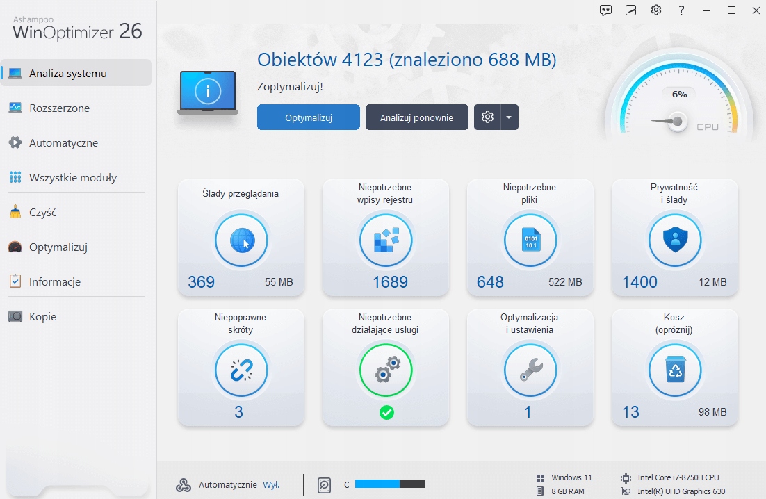 Недавно разработанный системный анализ включает в себя все, что вам нужно знать с первого взгляда. В дополнение к спидометру загрузки процессора, благодаря нашему новому инструменту Privacy Traces Cleaner теперь вы можете напрямую взглянуть на использование диска и информацию, связанную с конфиденциальность! Увеличьте размер окна программы, чтобы получить еще больше ценной информации системы, такие как количество несущественных файлов, служб и записей реестра или количество потенциально восстанавливаемое дисковое пространство. Системный анализ расскажет вам, что вам нужно знать!