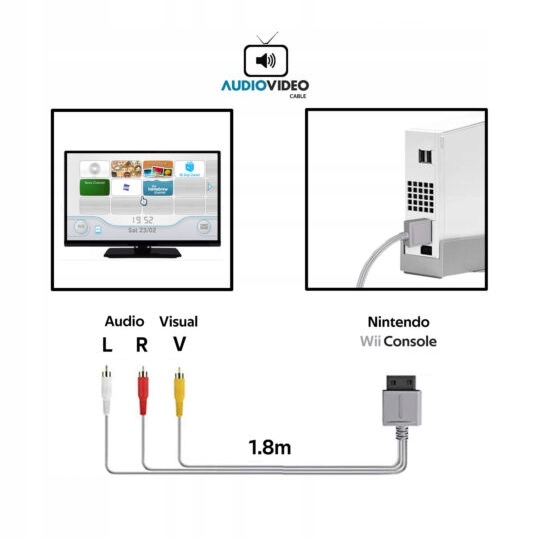 Kabel umożliwia podłączenie konsoli Nintendo Wii do telewizora. Kabel pozwala na wysyłanie obrazu i dźwięku wysokiej jakości do wszystkich telewizorów nawet tych starszego typu. Dzięki odpowiedniej długości (ok. 180 cm) możliwe jest umieszczenie konsoli od telewizora w odległości jaka jest dla Ciebie wygodna. Kabel posiada 1x chinch video oraz 2x chinch audio.