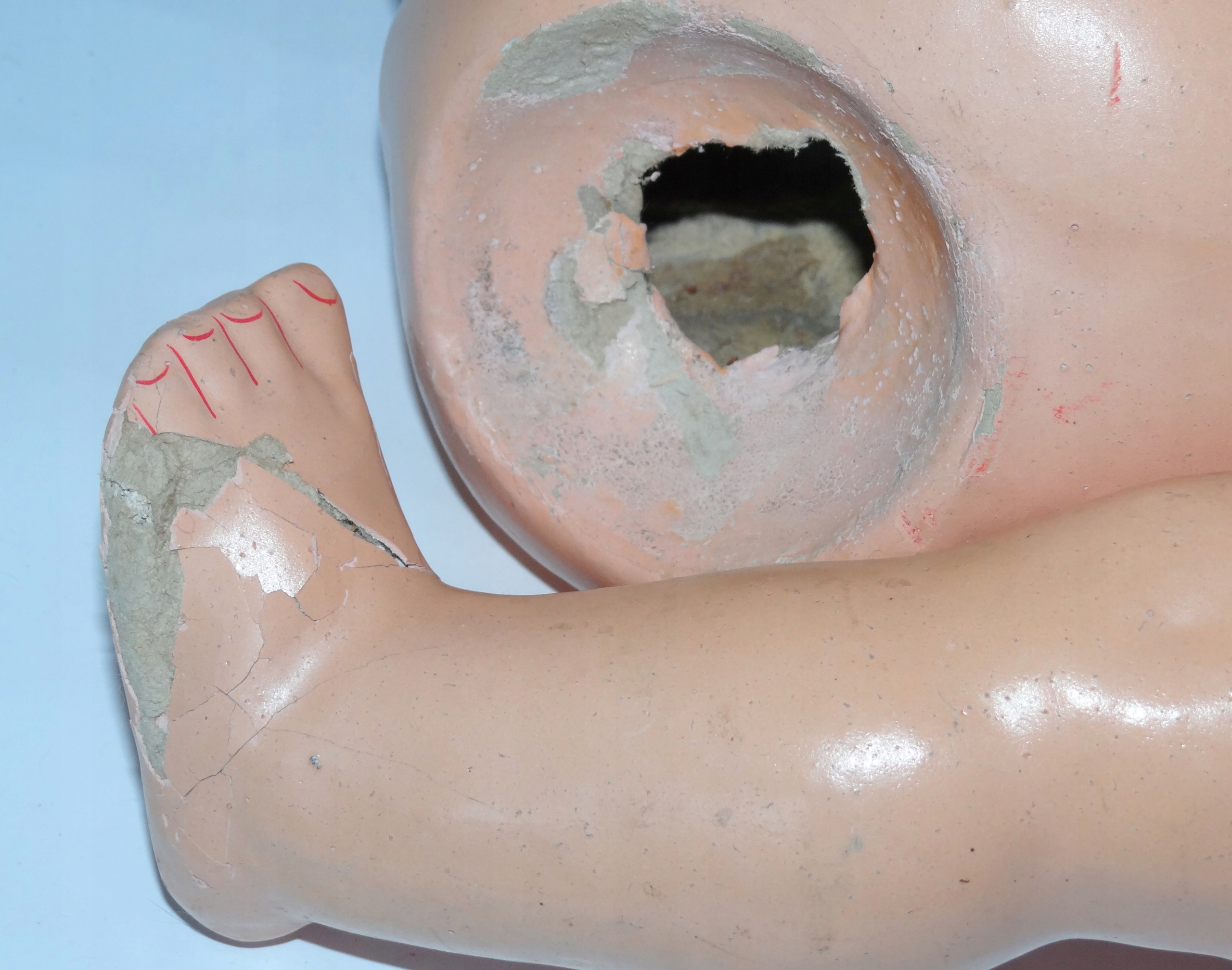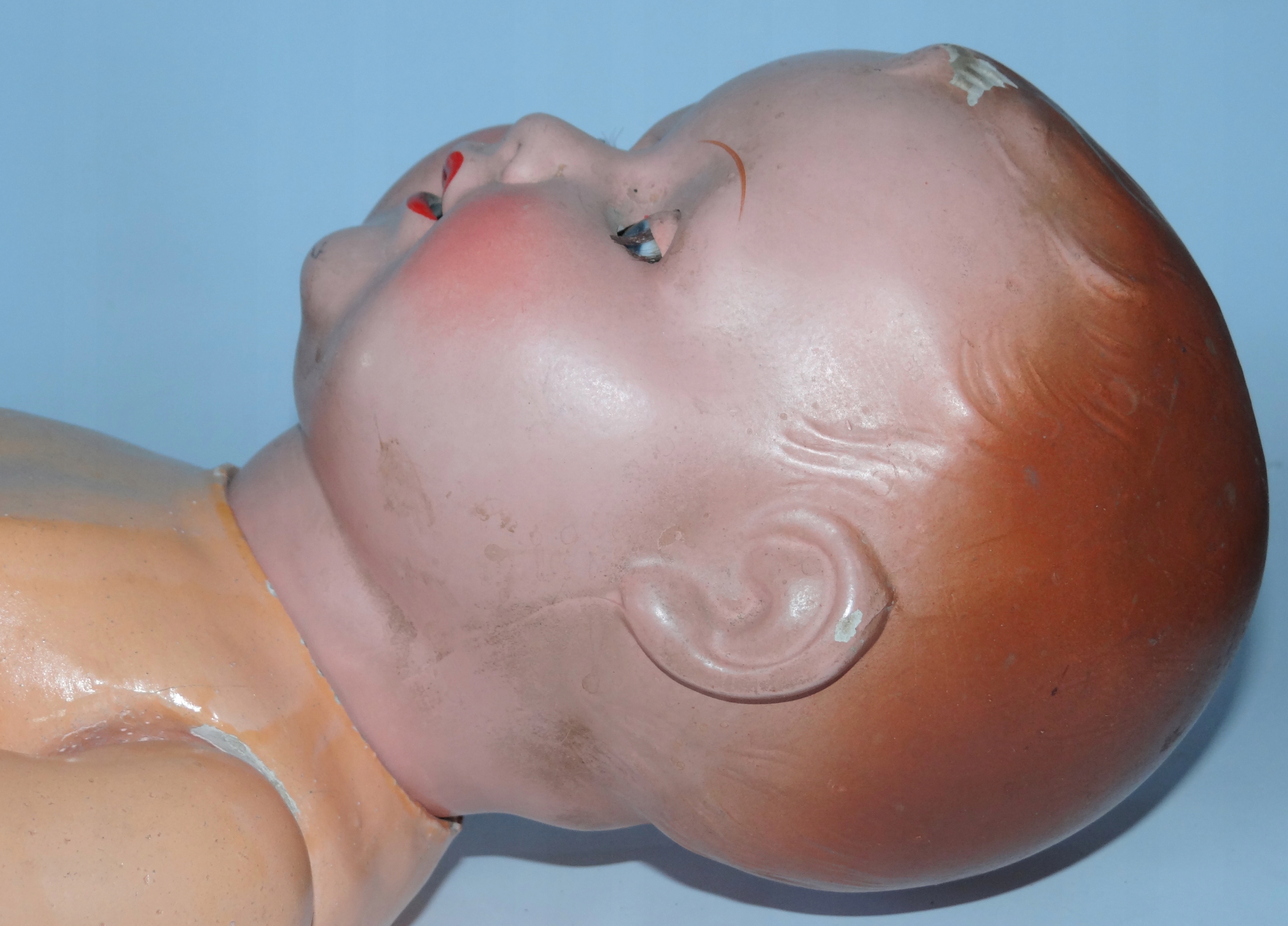Lalka ma główkę biskwitową a ciałko z papieru mache