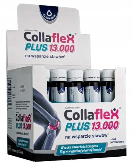 Oleofarm Collaflex Plus 13.000 to suplement diety w płynnej formie shota o smaku porzeczkowym. Jedna fiolka zawiera 13 000 mg hydrolizowanego kolagenu typu I i III, 80 mg witaminy C i 30 mg ekstraktu z kłącza imbiru (Zingiber officinale).