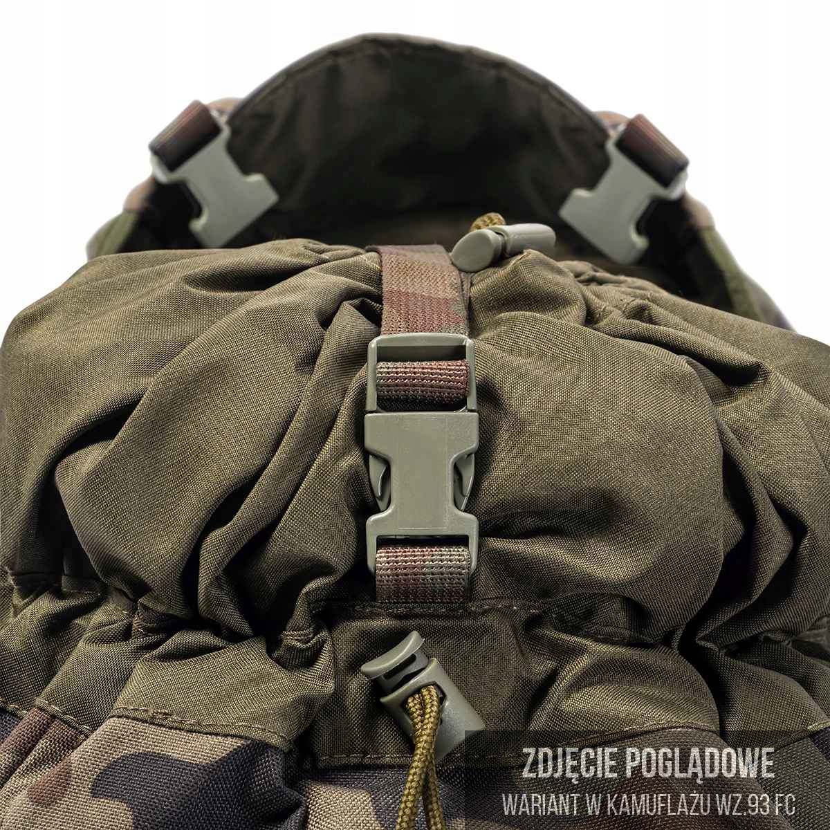 NOWA WERSJA Z TAŚMAMI W KAMUFLAŻU. ZDJĘCIA Z JASNYMI SĄ POGLĄDOWE Duży, typowo militarno-survivalowy plecak o dużej pakowności i jeszcze większej możliwości troczenia sprzętu na pasach typu molle. Główna komora jest dwudzielna (wewnętrzny kołnierz dzieli ją na dolną część 1/3 i górną 2/3 pojemności). Dostęp do bagażu przenoszonego na dnie zapewnia odpinana klapa znajdująca się u dołu. Pojemność plecaka dodatkowo zwiększa możliwość przypięcia dodatkowych sakw bocznych. Główna komora od góry jest zamykana miękkim kołnierzem zapinanym na suwak i dla stabilności dopinana trokiem. Klapa plecaka to dwie kieszenie: wierzchnia i głęboka, pojemna kieszeń wewnętrzna. W dnie plecaka znajduje się jeszcze jedna mała kieszeń, w której ukryta jest przeciwdeszczowa pelerynka na plecak. Wygodę noszenia zapewnia regulowany system nośny (FAS Plus) i szeroki pas biodrowy. Stabilność przenoszonego bagażu gwarantuje układ taśm kompresyjnych. Wyjątkową trwałość i niezawodność w każdych, nawet najbardziej ekstremalnych warunkach zapewniają zastosowane nowatorskie rozwiązania konstrukcyjne, wysoka jakość wykonania oraz materiały z którego plecak został wykonany.