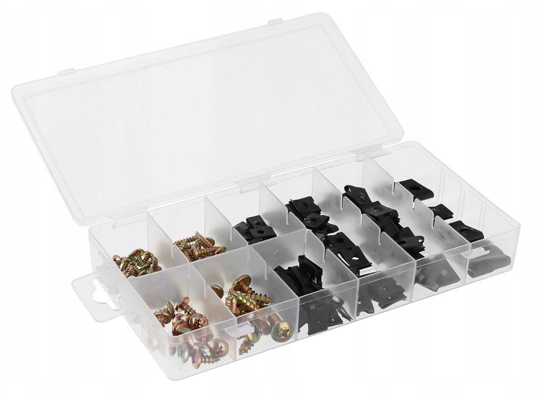 Komplet ten umożliwia szybkie połączenie cienkich blach, w których nie ma możliwości wykonania otworu. Całość umieszczona jest w wygodnym opakowaniu typu "sortownik", co ułatwia organizację i przechowywanie elementów.