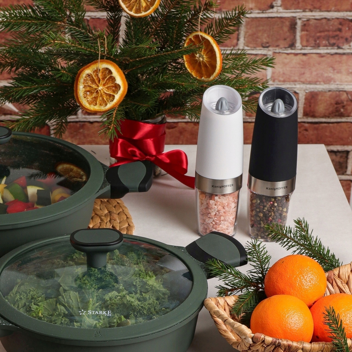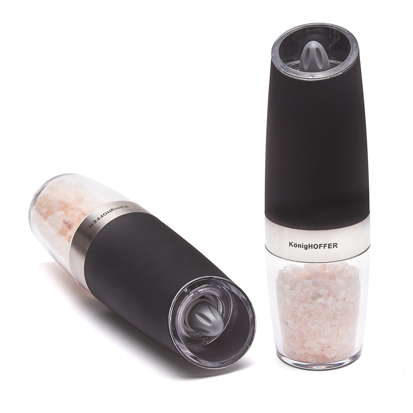 Электрические и гравитационные мельницы Konighoffer Luca White и Black предлагают короткое время получения нужное количество специй. Набор также дает вам точное измерение молотого перца и соль, а также возможность работать одной рукой. Их дизайн сочетает в себе элементы из пластика из искусственной и прочной нержавеющей стали. Мельницы были оснащены гравитационной системой запуск шлифовального механизма с электрическим приводом, питаемым от батарей. Просто переверните их прозрачный контейнер со специями вверх, чтобы они начали работать. Легко проверить количество соли или перец внутри, и вы планируете покупку, чтобы дополнить их запас. Они также имеют подсветку области, которую вы приправляете, чтобы облегчить вам дозирование. Модели питаются от батареек AAA 1,5 В-нет они являются частью комплекта и должны быть приобретены отдельно.
