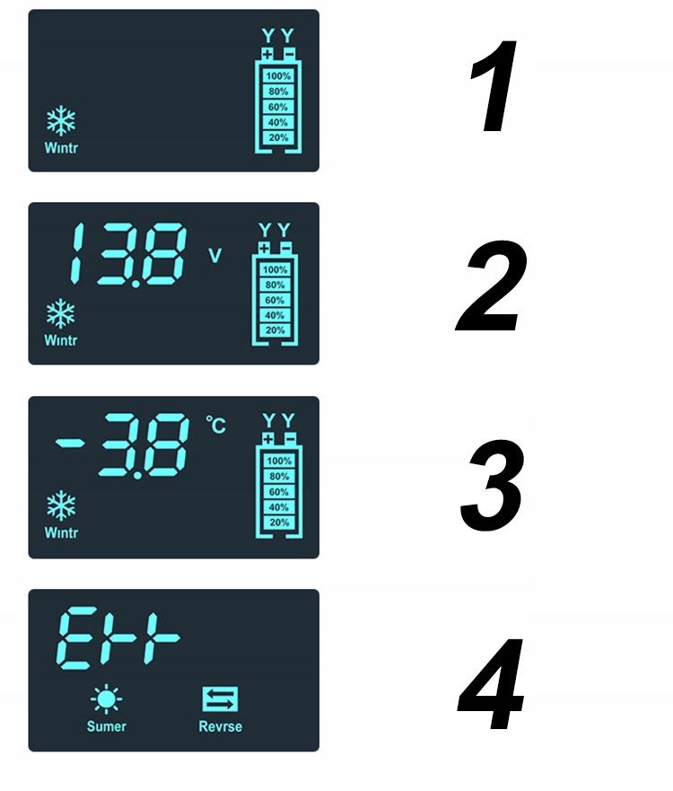 W zależności od wykrytej temperatury na ekranie podświetli się adekwatna ikonka i prostownik optymalnie naładuje podłączony pojazd/urządzenie.