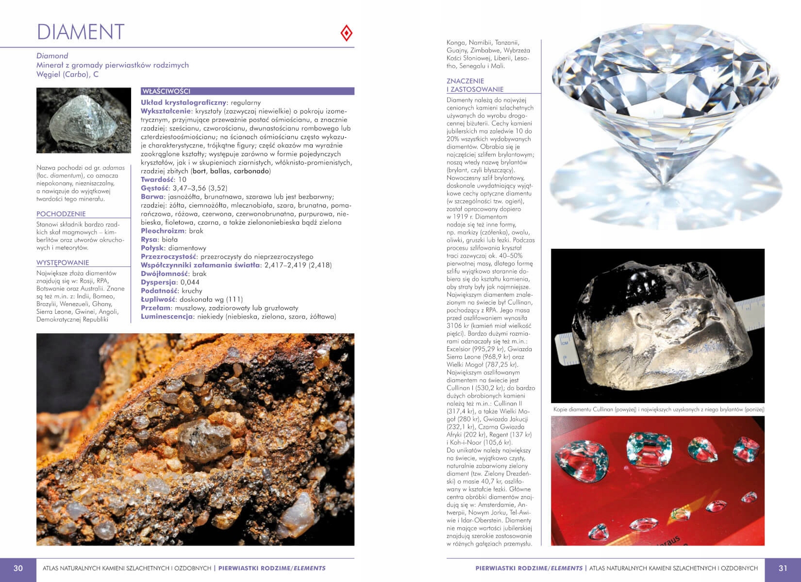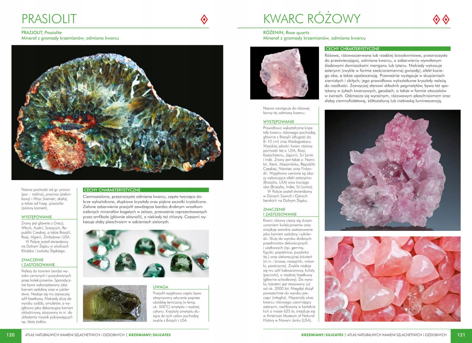 Znanych jest kilkaset kamieni szlachetnych i ozdobnych reprezentowanych przez minerały i skały (oraz ich odmiany), a także związki pochodzenia organicznego. W atlasie ukazano 120 wybranych, najczęściej spotykanych, naturalnych kamieni szlachetnych i ozdobnych, z czego przeważająca większość należy do minerałów. W opisach uwzględniono zarówno ich właściwości, jak i pochodzenie, występowanie oraz zastosowanie.