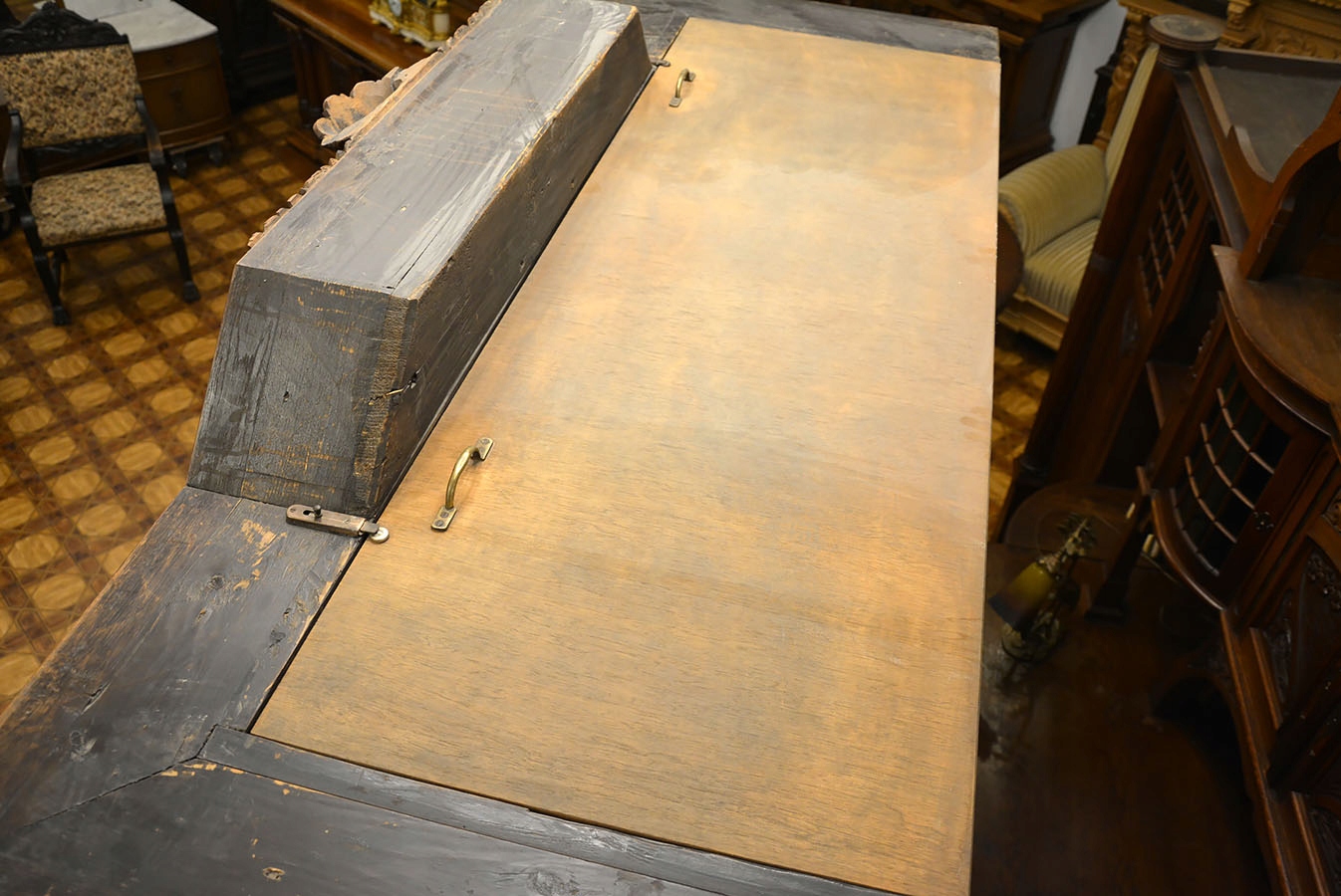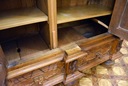 Wsparta na potężnych toczonych nogach. Osadzona na potężnej, masywnej podstawie dekorowanej szczegółową snycerką. Podstawa przedzielona trzema pilastrami dekorowanymi floralną snycerką. Po bokach dwie imitacje szuflad z bardzo dekoracyjnymi licami zdobionymi poduchami o gwieździstym zarysie. Uchwyty w kształcie bardzo precyzyjnie wyrzeźbionych lwich głów!