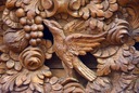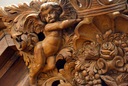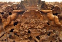 Wieniec górny z profilowanym gzymsem, potężnym wypiętrzeniem pośrodku z bardzo bogato rzeźbionymi kwiatami, koroną i figurami puttów po bokach. Pod herbem figura precyzyjnie wyrzeźbionego orła.