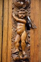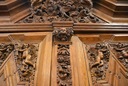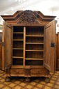 Szafa dwudrzwiowa, przedzielona trzema wysokimi bardzo bogato rzeźbionymi pilastrami. Drzwi mebla pełne - bardzo ozdobne z gwieździstą poduchą, ujęte na obrzeżach profilowanymi listwami. W górnych narożach skrzydeł drzwi płaskorzeźbione postaci puttów - personifikacje pór roku!