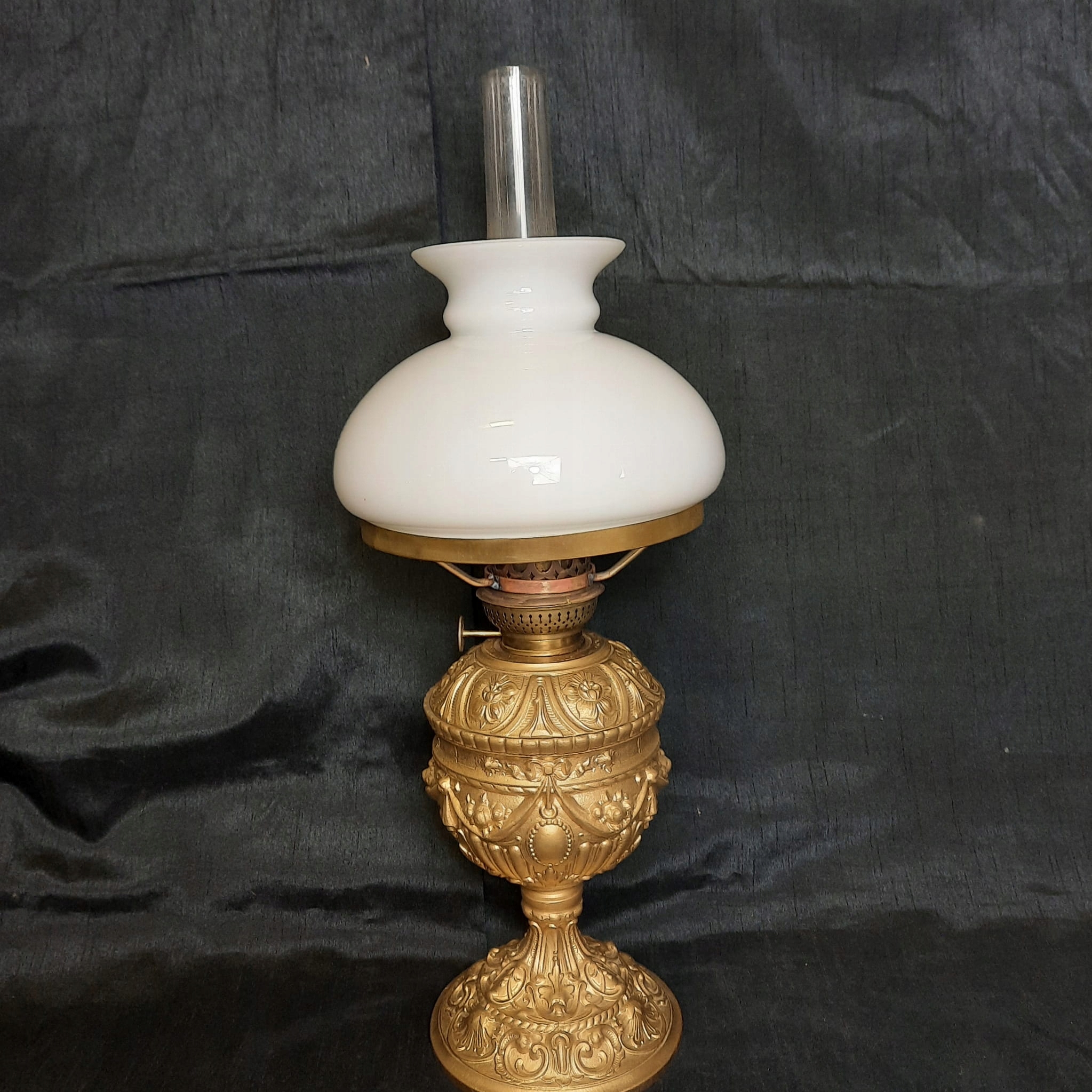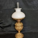 Lampa naftowa secesyjna z okresu 1900 wykonana z cynkalu klosz oraz komin wykonany ze szkła