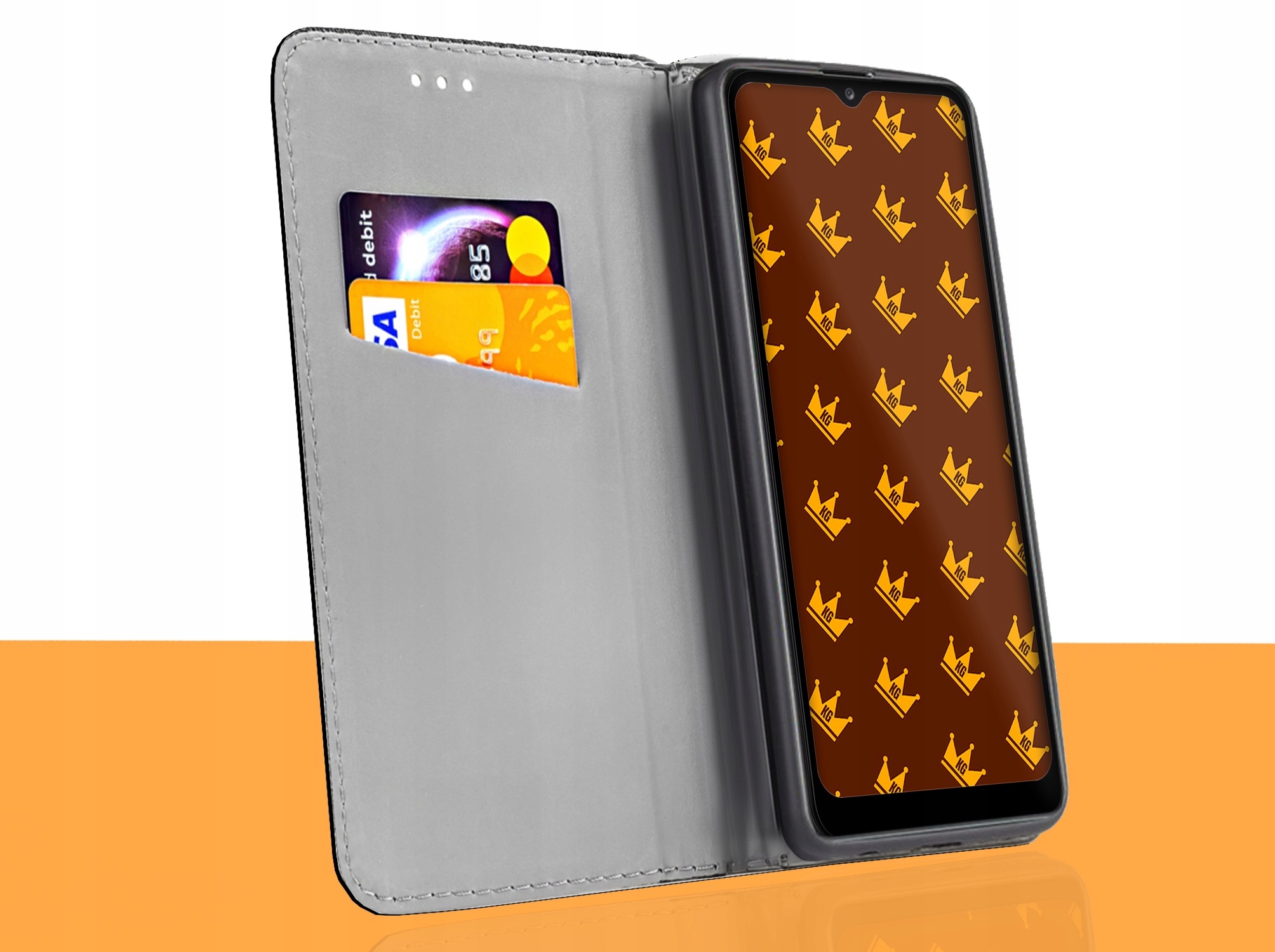 Funkcja podpórki w etui z klapką umożliwia wygodne oglądanie filmów i zdjęć. Etui składa się w pozycję, która utrzymuje telefon w poziomie tak, aby ekran smartfona był skierowany do nas pod odpowiednim kątem.