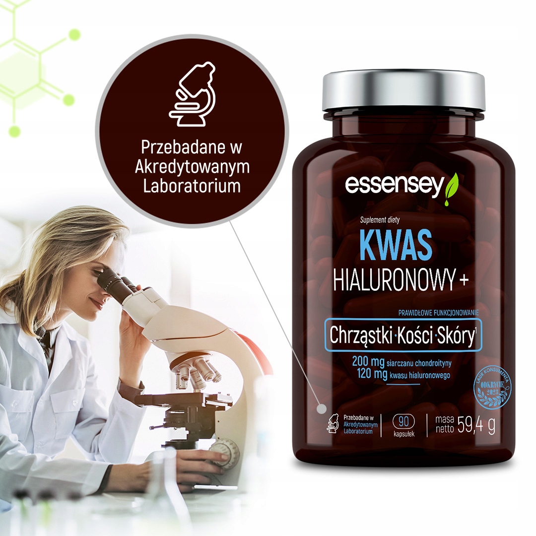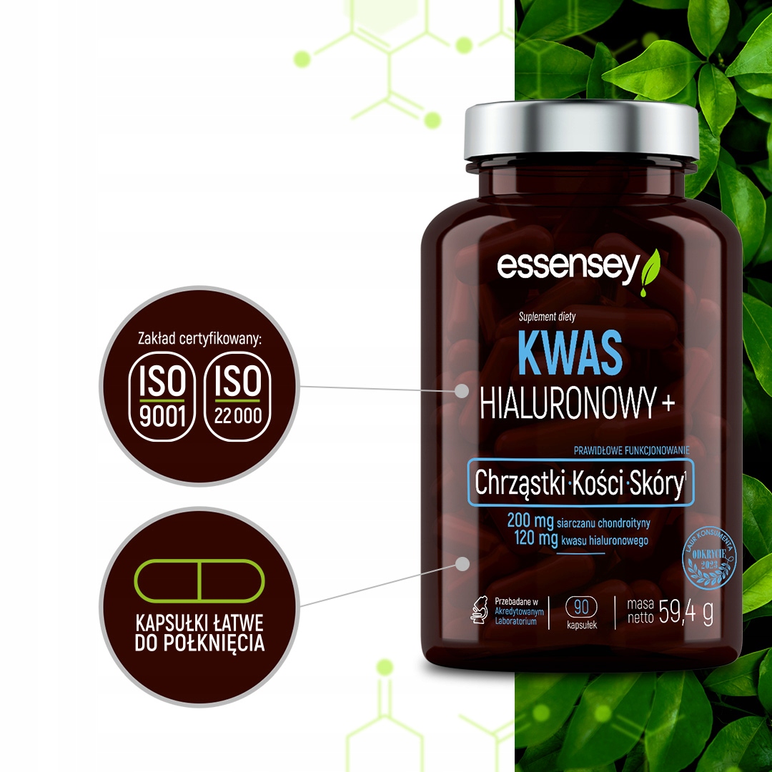 Suplement diety ESSENSEY KWAS HIALURONOWY+ zawiera kwas hialuronowy, witaminę C, prolinę i chondroitynę. Witamina C pomaga w prawidłowej produkcji kolagenu, przez co wspiera funkcjonowanie skóry i naczyń krwionośnych [1]