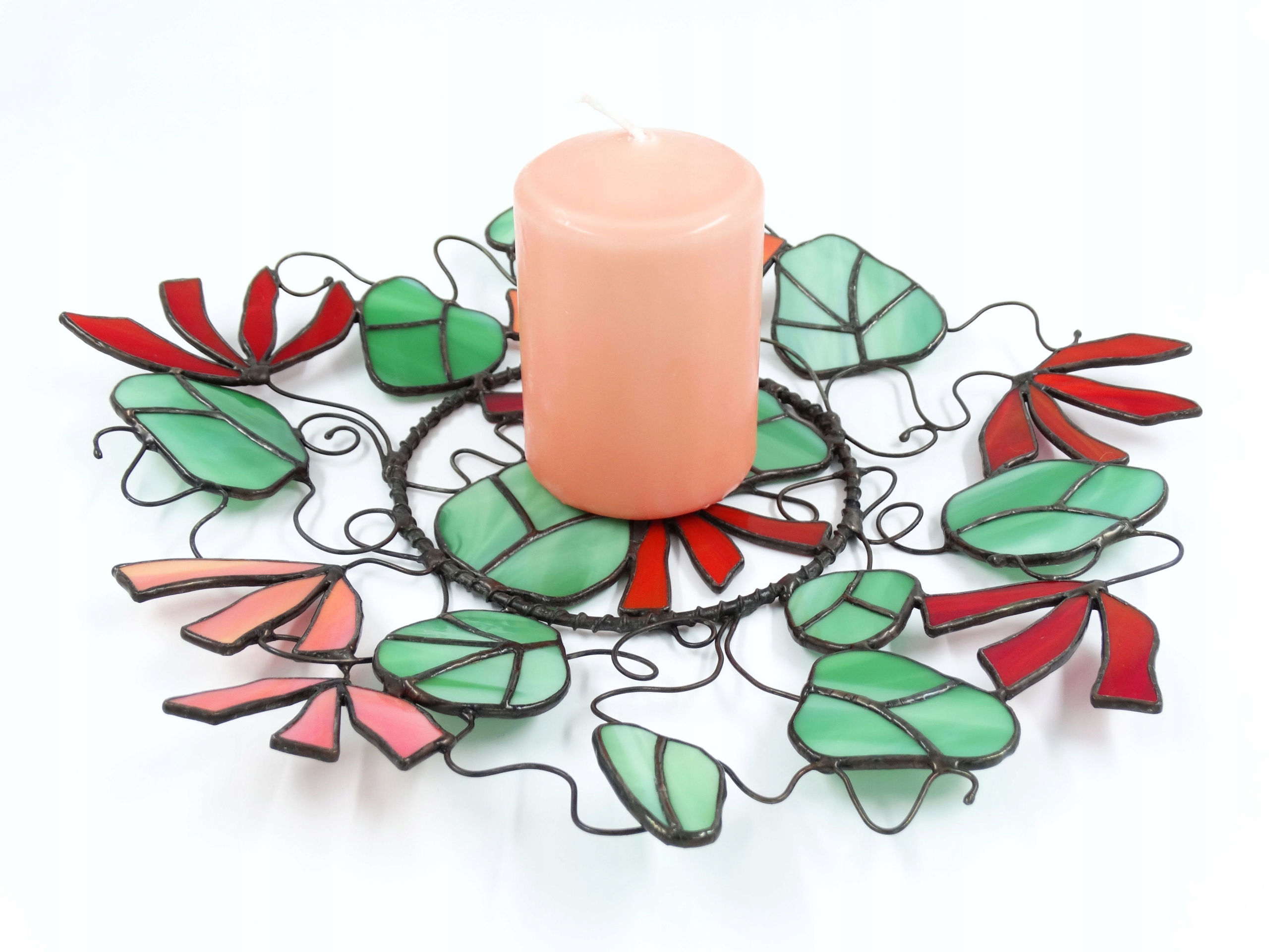 Paterę wykonałam techniką Tiffany'ego z wysokiej jakości szkła Spectrum. W metodzie tej elementy wycięte z większej tafli szkła są dokładnie szlifowane na brzegach, oklejane taśmą miedzianą, a następnie lutowane cyną. Cyna może być patynowana na kolor lub pozostawiona w naturalnej postaci. W tym przypadku elementy pokryłam patyną w kolorze czarnym, co pięknie kontrastuje z pastelowymi barwami szkła. Patera może również stanowić podkładkę pod dużą świecę.
