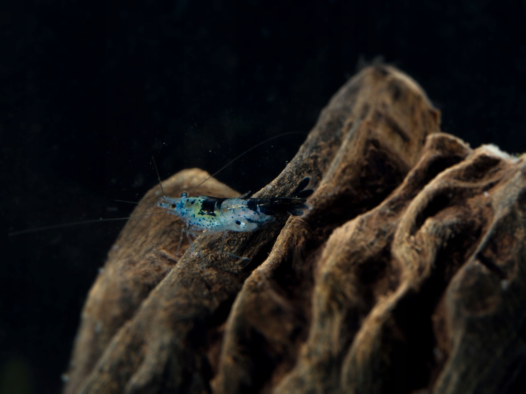 Opis:Krewetka o bardzo nieregularnym ubarwieniu. Krewetki mają różnie rozmieszczone plamy na ciele koloru granatowego, ciemnoniebieskiego na tle lekko zabarwionego tułowia na niebiesko.