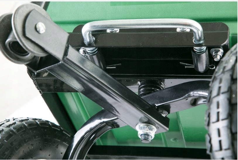 Wózek ogrodowy posiada funkcję wywrotki, która polega na możliwości podnoszenia misy do góry tzw. “kiprowania”. Jest to specjalna funkcja pozwalająca na znaczne przyspieszenie prac z wykorzystaniem wózka. Dla zabezpieczenia przed niekontrolowanym podniesieniem się misy została użyta specjalna stalowa blokada zabezpieczająca.