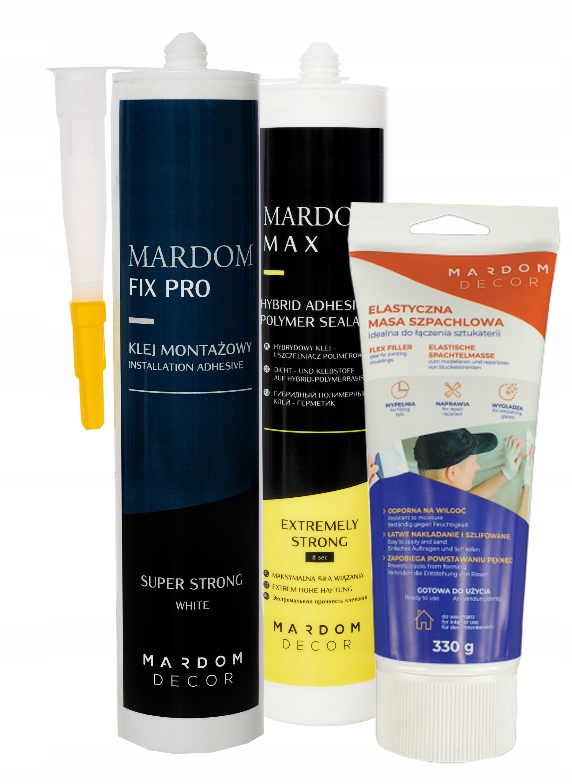 Dzięki użyciu masy szpachlowej, listwy są perfekcyjnie gładkie i nieskazitelne. Szpachla maskuje widoczność łączeń, wygładza wszelkie ubytki, które powstały podczas montażu. Jest odporna na wilgoć, łatwa w obróbce i szlifowaniu. Produkt umożliwia estetyczny i fachowy montaż sztukaterii.