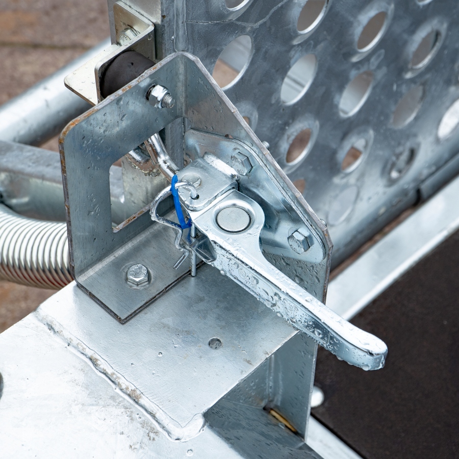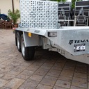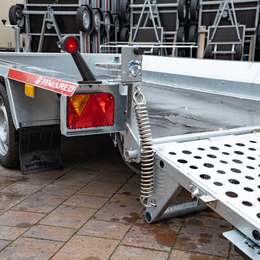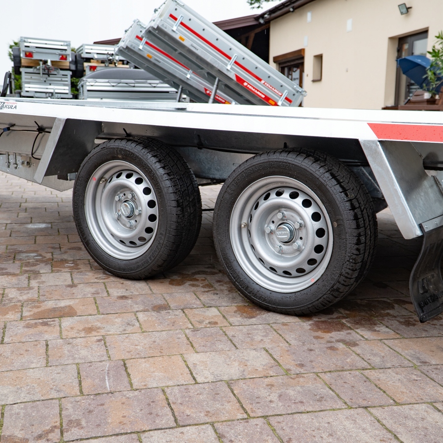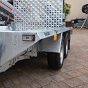 Solidna spawana przyczepa do przewozu maszyn budowlanych oraz bardzo ciężkich materiałów. Oryginalna konstrukcja daje możliwość chodzenia po całej długości burt wyposażonych w taśmy antypoślizgowe. Rama nośna spawana wykonana ze stalowych profili zamkniętych. Podłoga wykonana ze sklejki wodoodpornej antypoślizgowej zaopatrzona w solildne uchwyty podłogowe do mocowania ładunku zapewniające bezpieczeństwo przewożonych towarów. Bardzo wytrzymały dyszel typu V i podpory stabilizujące najazd. Podpora łyżki oraz koło podporowe z automatem składania w standardzie. Sprężyny ułatwiające opuszczanie i podnoszenie najazdu. Możliwość zastąpienia szerokiej rampy najazdowej dwoma najazdami redukując tym samym masę przyczepy, a co za tym idzie zwiększając jej ładowność.
