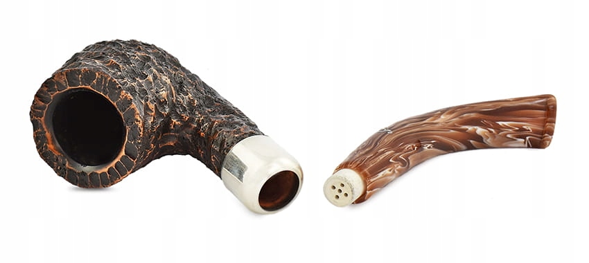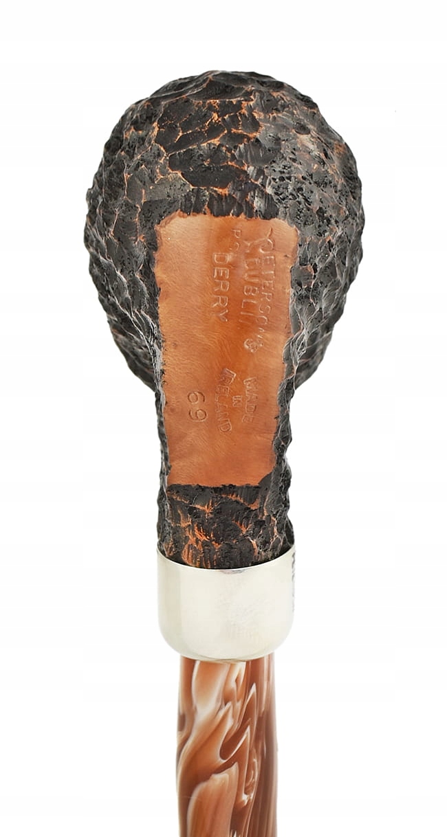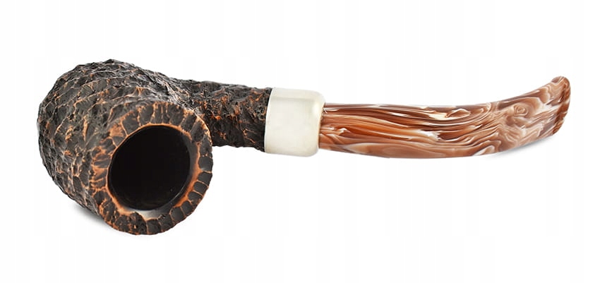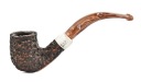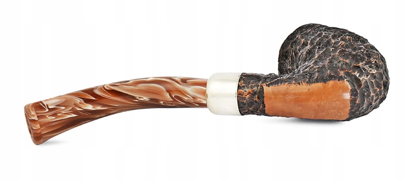 Oryginalna fajka irlandzkiej firmy Peterson of Dublin w subtelnie wygiętym kształcie. Wrzoścowa główka została utrzymana w ciemnobrązowym wykończeniu z jaśniejszymi refleksami podkreślającymi precyzyjne i głębokie ryflowanie, które wykonano na niemal całej powierzchni główki. Gładki fragment od spodu szyjki w jasnobrązowych barwach ukazuje naturalne usłojenie drewna. Miejsce to sygnowano logo producenta, nazwą i numerem modelu. Akrylowy ustnik w karmelowych barwach umieszczono bezpośrednio w dole czopowym. Okrągła szyjka zakończona eleganckim, szerokim niklowym ustnikiem w srebrnym kolorze. Komin prekarbonizowany, pomieści średnią ilość tytoniu.