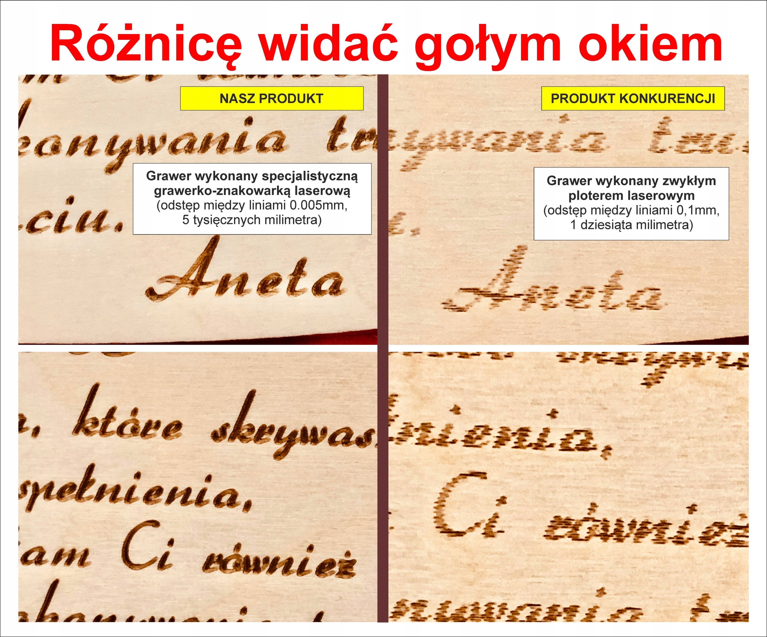 Разницу между нашей продукцией и продукцией конкурентов мы представим на на фотографии ниже, на которой вы можете увидеть довольно заметную разницу в качестве гравировки, которая происходит при гравировке лазерным плоттером специализированная маркировочная машина, в которой шаг пути радиуса лазера для гравировки фанеры устанавливаем на 0,01 мм и лазерным плоттером CO2 в который стандартный ход составляет 0,2 мм, что дает в 20 раз большую точность воспроизведения и выразительный расцветка.