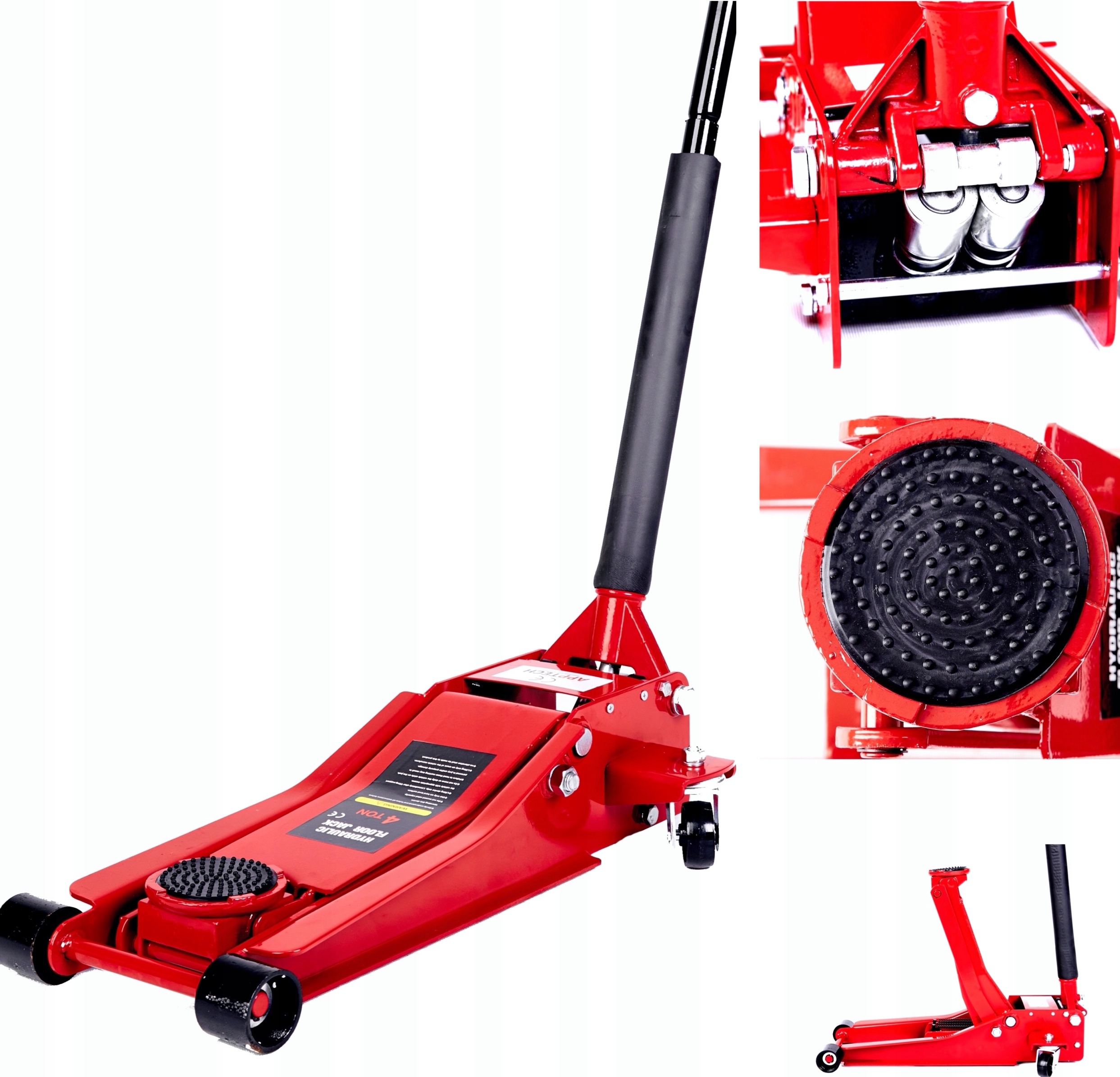 Podnośnik niskoproofilowy typu żaba 4T. Podnośniki zostały wyposażone w mocny 2 stopniowy siłownik ( 2 tłoki), oraz 4 mocne , szerokie koła - tylne koła skrętne
