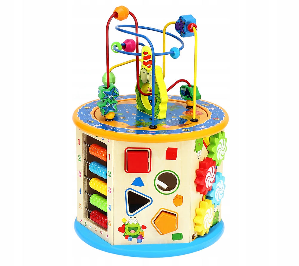 Na jednej ze ścianek kostki edukacyjnej znajduje się sorter wraz z kolorowymi drewnianymi klocuszkami. Dzięki tej funkcji, Twoje dziecko nie tylko pozna nowe kształty oraz kolory, lecz także usprawni swoje zdolności manualne.