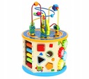 W zestawie drewnianej kostki edukacyjnej znajduje się sześć ciekawych ścian funkcyjnych z różnymi zadaniami do wykonania.