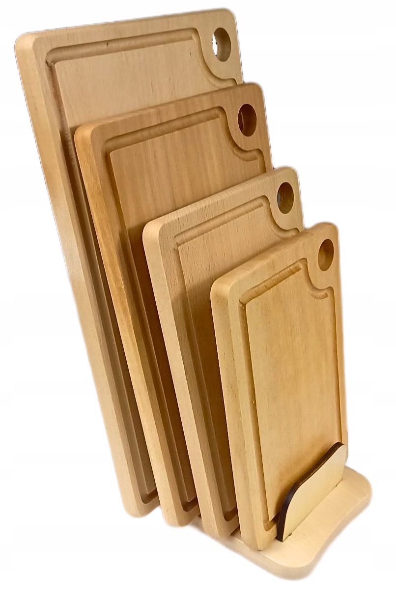 ✅ Zestaw desek kuchennych wykonanych z naturalnego drewna bukowego na stojaku drewnianym. Deski zawsze w zasięgu ręki dzięki stojakowi, który zajmuje niewiele miejsca i pięknie się prezentuje.