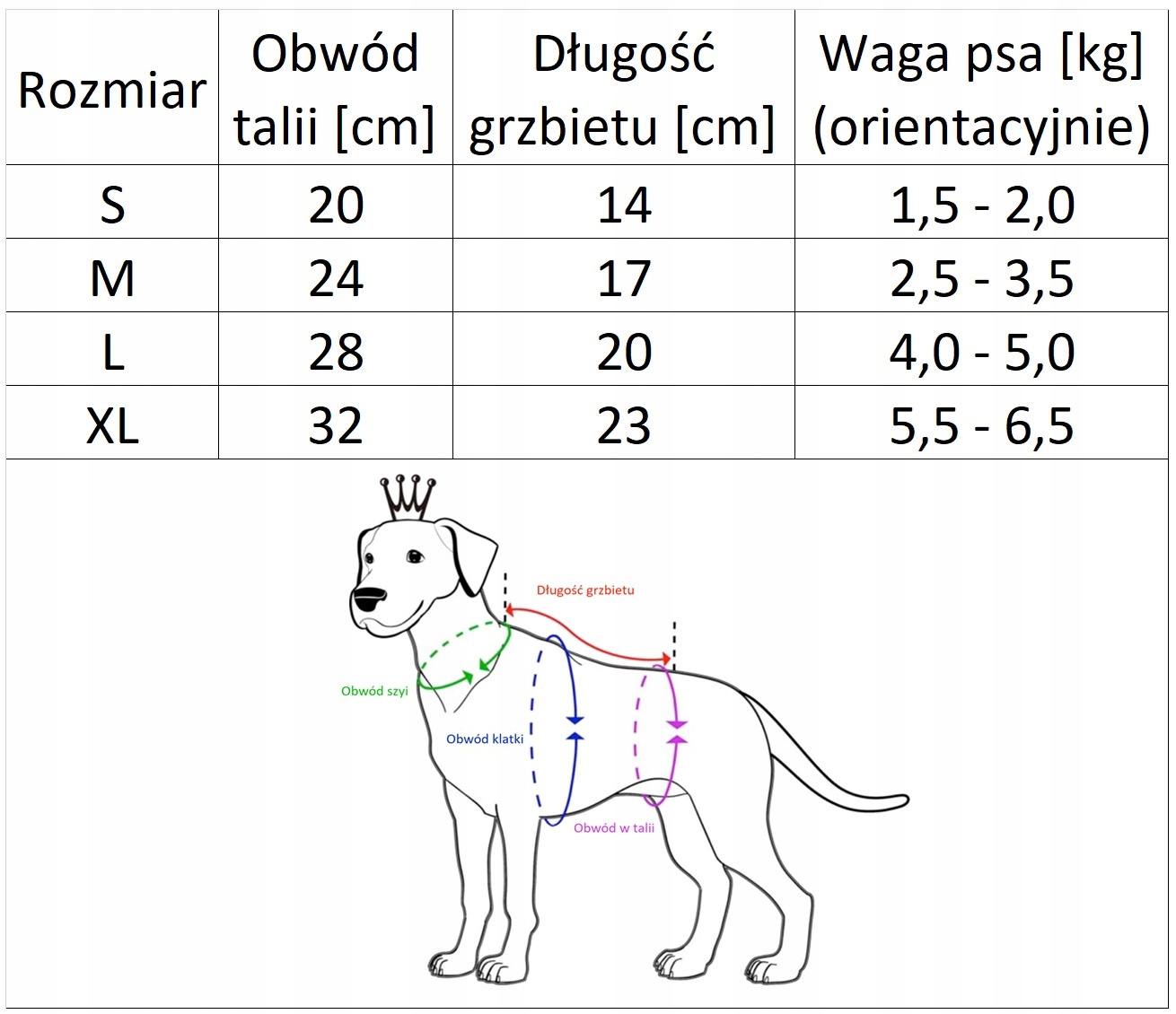 Wskazówka: Jeśli wymiary twojego pieska (z lekkim luzem) są bardzo bliskie któremuś rozmiarowi, wybierz większy rozmiar. Najważniejszym wymiarem jest obwód w talii!