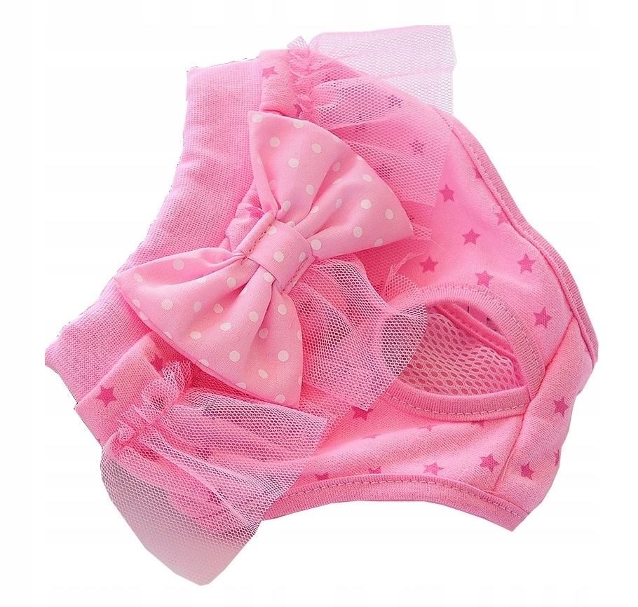 Majtki wykonane z wysokiej jakości dzianiny. Są miękkie, przewiewne, nie odparzają, nie ograniczają ruchów suczki. Nie posiadają plastikowych klamer wrzynających się w ciało psa.