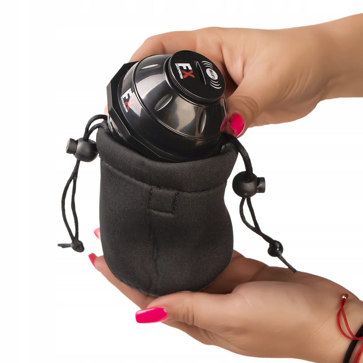 W zestawie: echosonda, etui, ładowarka, ładowarka samochodowa, kabel USB, 2 x nakładki do sonaru.